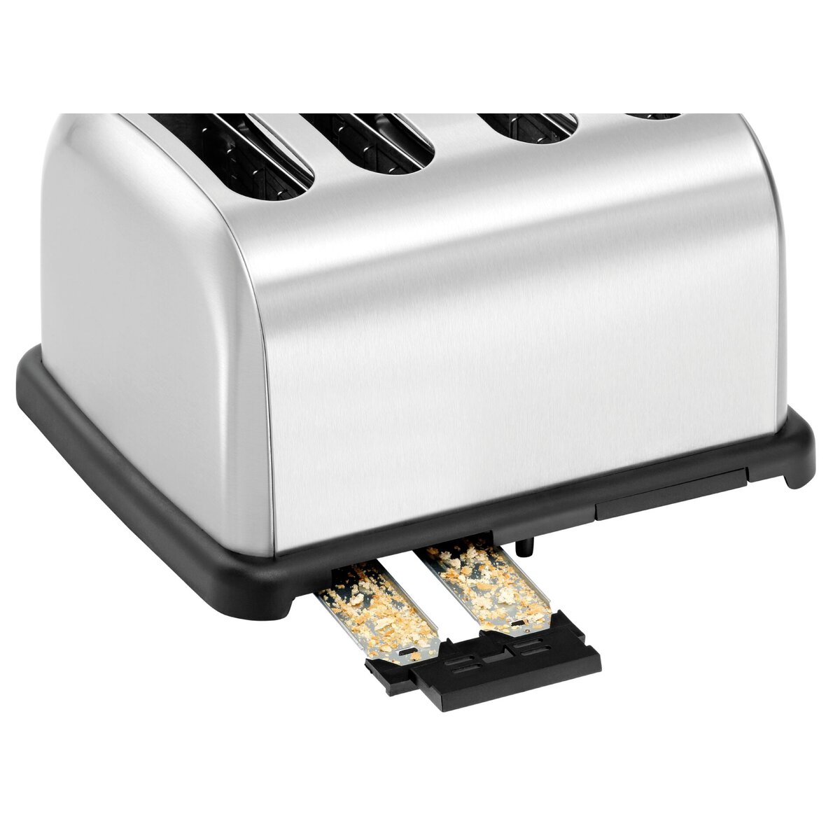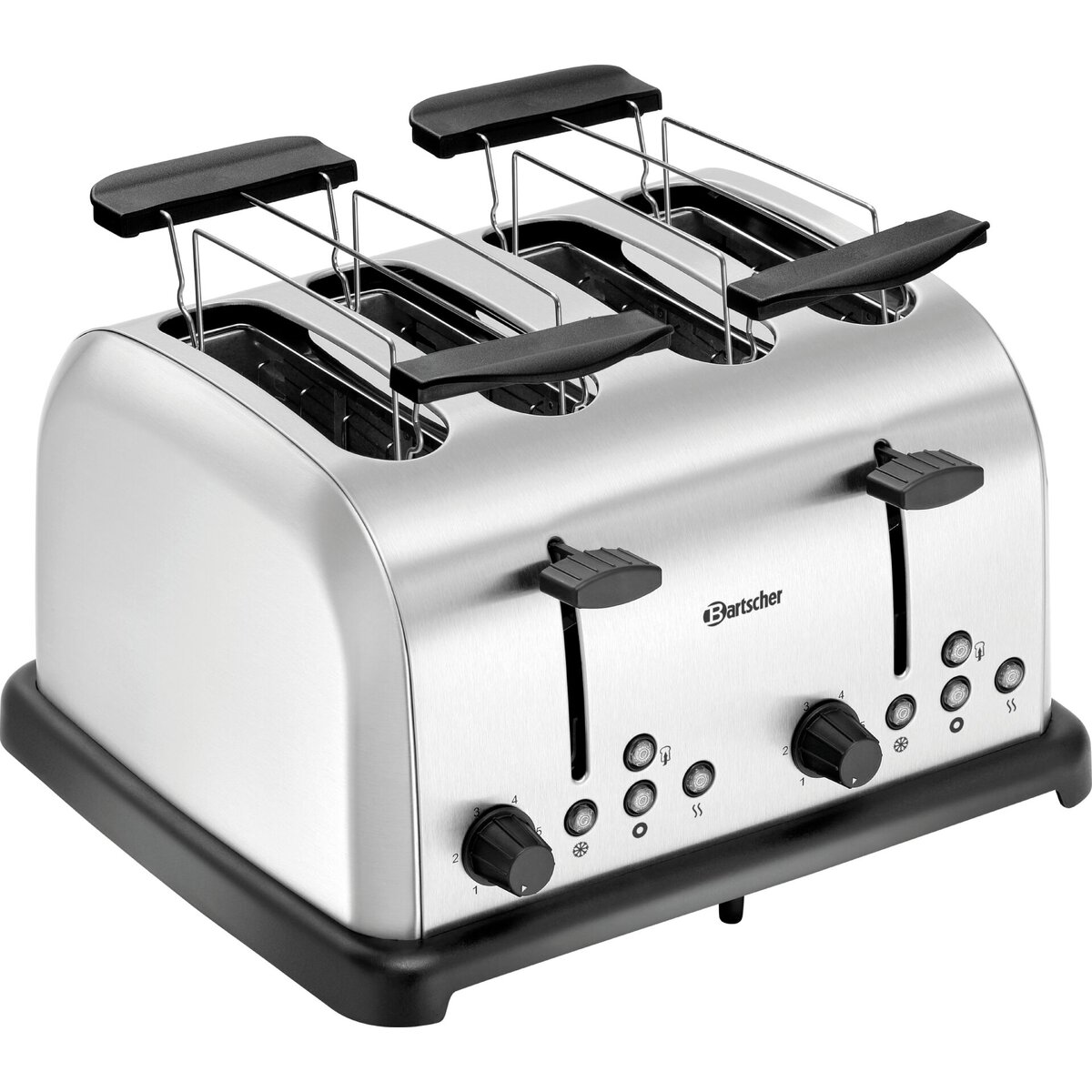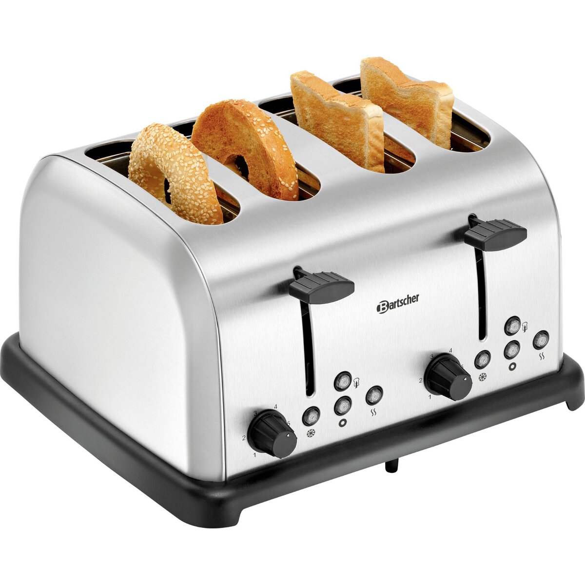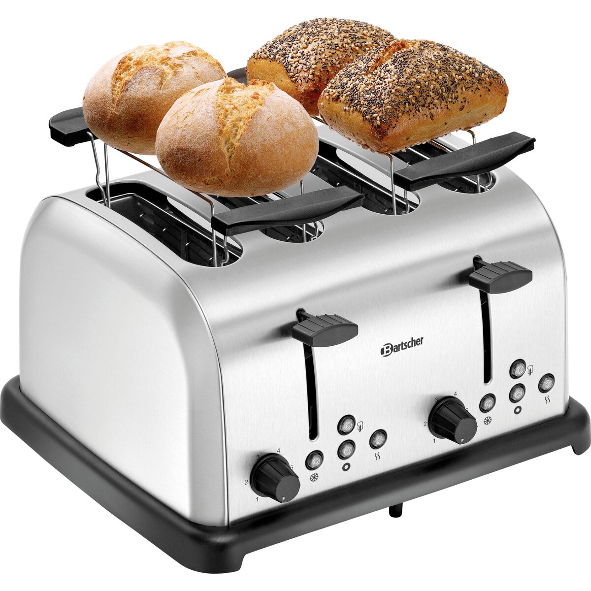 Material: Edelstahl gebürstet, 2 sep. Bedienfelder für je 2 Schlitze, Funktionen: Toasten, Auftauen, Aufwärmen, auch ein einseitiges Toasten von Bageln ist möglich, mit Abbruchtaste, 6 Bräunungsstufen, 2 Krümelschubladen, 2 Brötchenaufsätze
