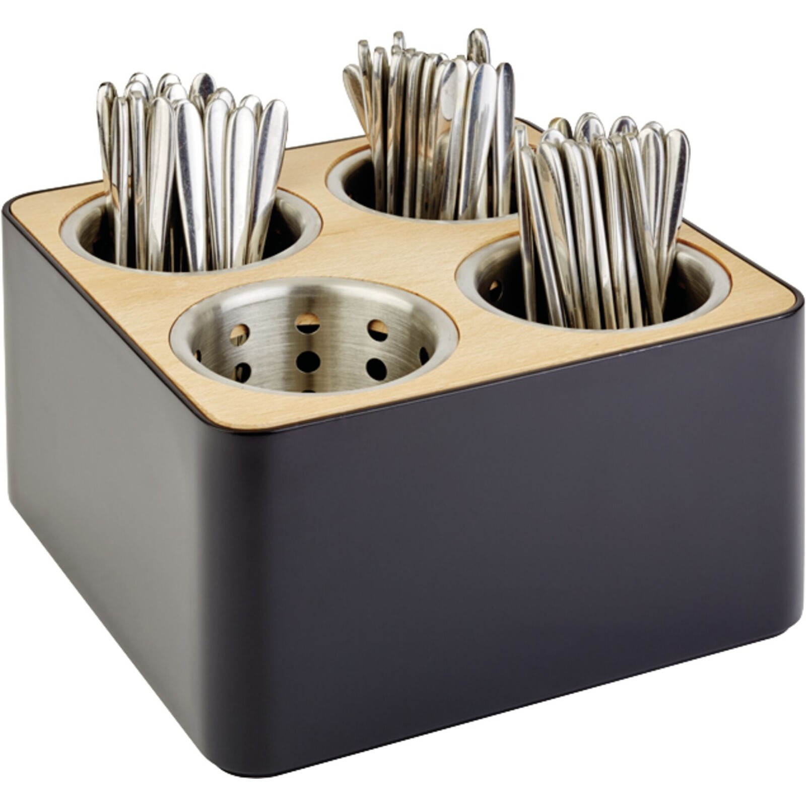 Schwarze Kunststoff-Box, SAN, Holz inkl. 4 Aussparungen Ø10 cm. Inkl. 4 Edelstahl Köcher. Stapelbar.