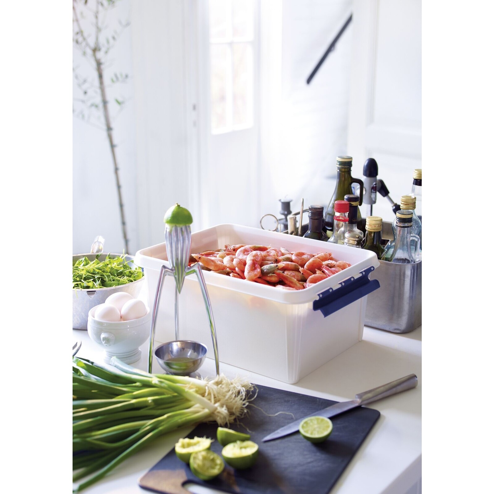 Weiß. Für Transport und Lagerung von Lebensmitteln oder Geschirr, Besteck etc. Schlagfest, stapelbar und beständig gegen Temperaturwechsel (-40 bis + 120°C). Mit Deckel und Verschlussclips. 10 Jahre Garantie. Dazu sind 3 verschiedene Einsätze erhältlich: 150304: Einsatz 13x12x15 cm, transparent. 150305: Einsatz 6er Set, transparent bestehend aus 3 Boxen á 25x11 cm + 3 Boxen á 10,3x8,3 cm. 150306: Einsatz 37x28x9 cm transparent.