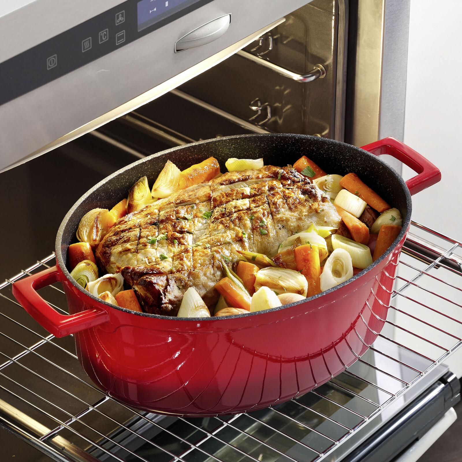 Aluguss antihaft, rot. Länge mit Griffen: 41,1cm. Enthält 1 Bräter, 1 Aluguss-Deckel mit Selbstbefeuchtungskreislauf (Zacken) und 2 Thermoschutzgriffe. Antihaft-Beschichtung mit echten Steinpartikeln. Extra starker, verzugsfreier Boden. Bodenstärke: 4,5mm. Backofengeeignet bis 240°C (ohne Thermogriffschützer) / 200°C (mit Thermogriffschützern). Für alle Herdarten geeignet auch Induktion (Induktionsboden Ø19,6cm). Nicht spülmaschinengeeignet.