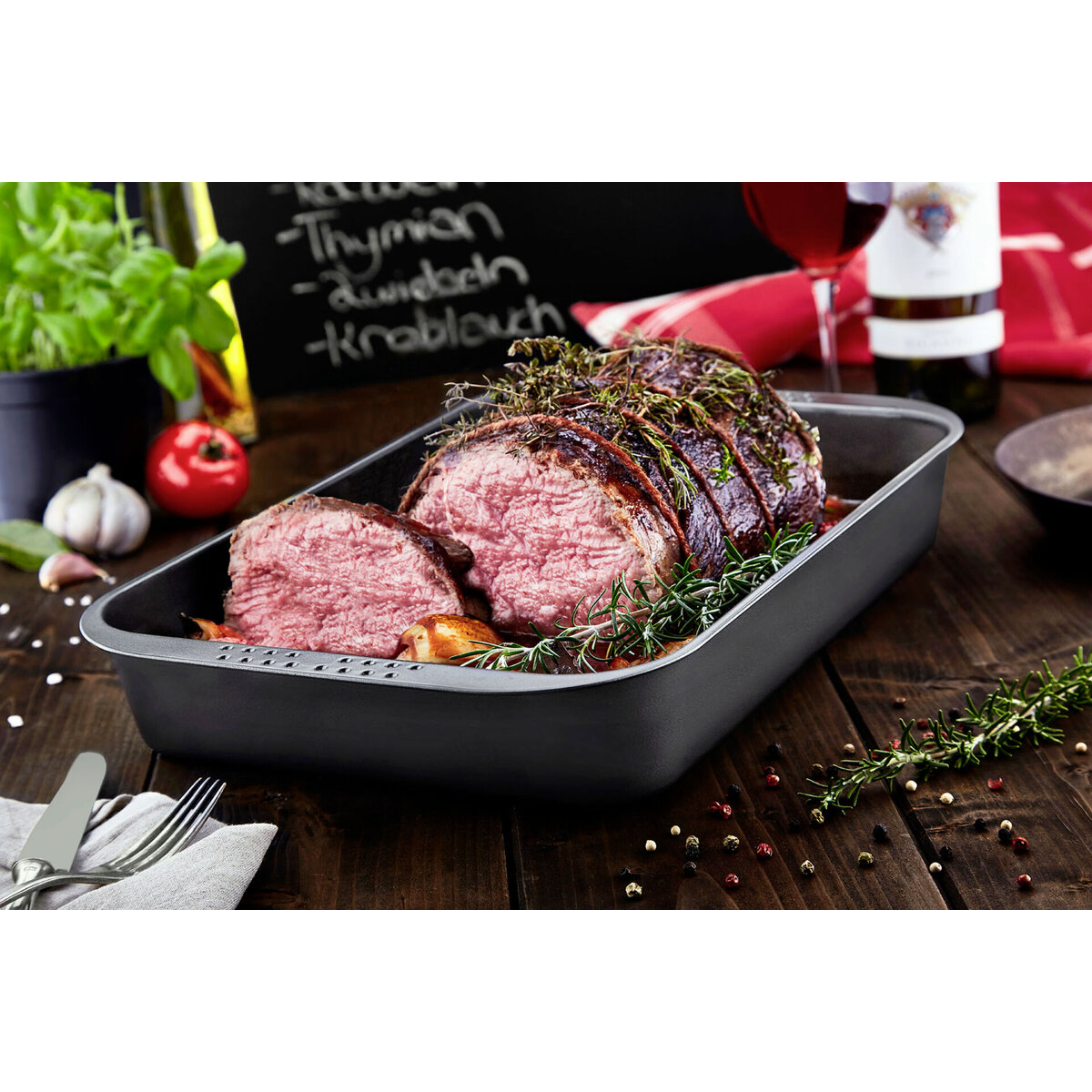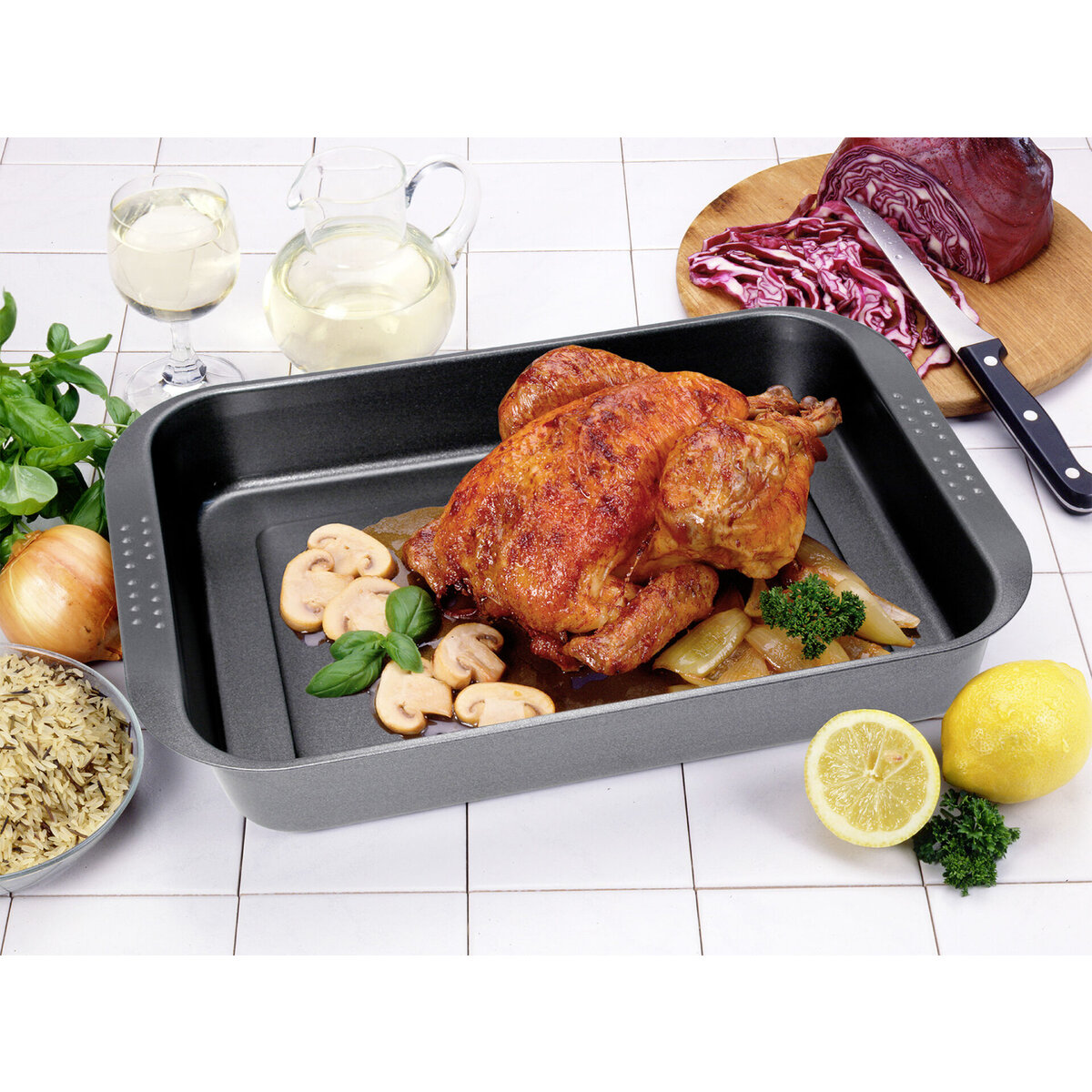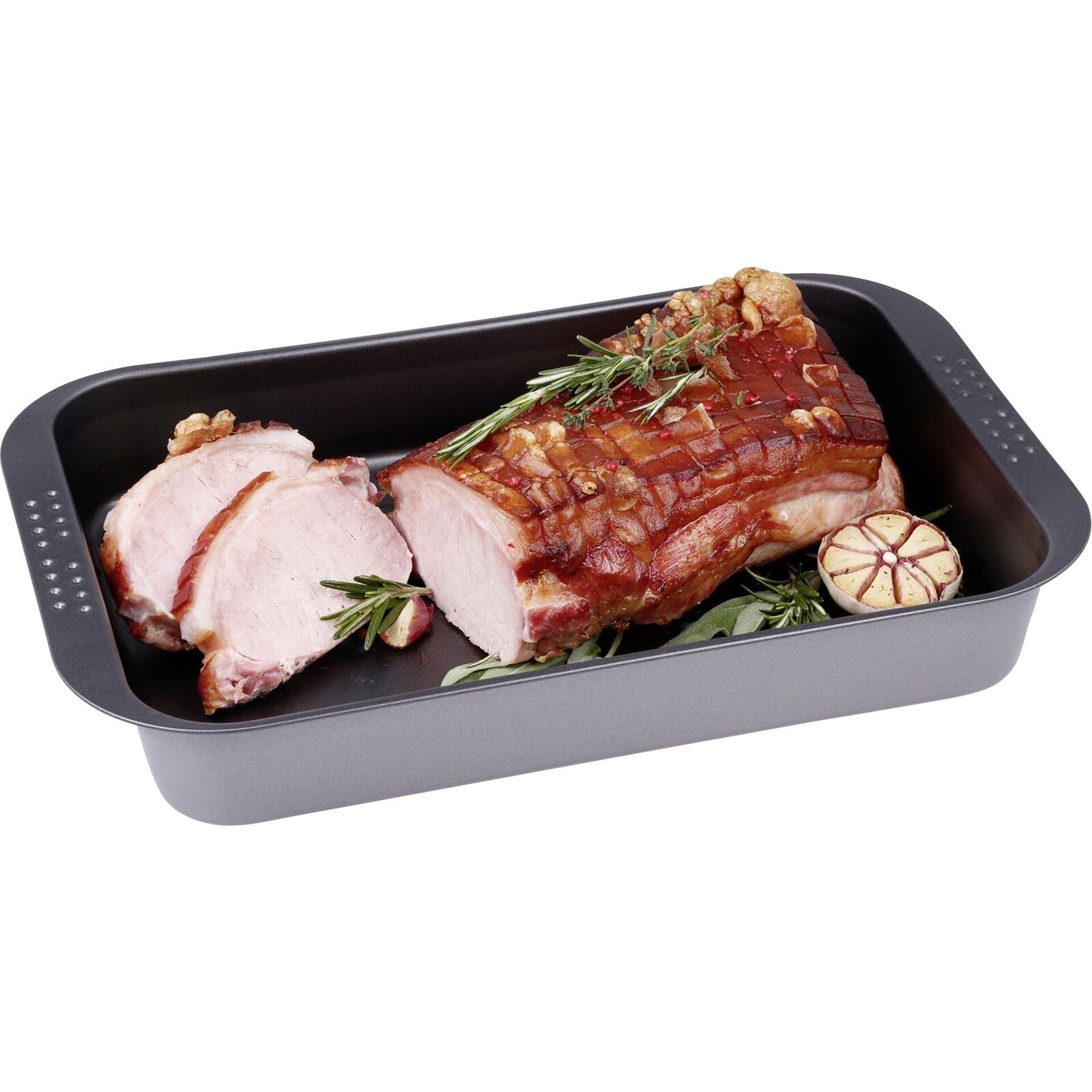 ILAG Antihaftbeschichtung - Zweischicht-System, bis 250°C hitzebeständig. Auch zum Backen von z. B. Brot geeignet. Mit seitlichen Griffmulden und Arretierungspunkten, um eine zweite Form als Deckel verwenden zu können. Farbe: anthrazit-metallic.