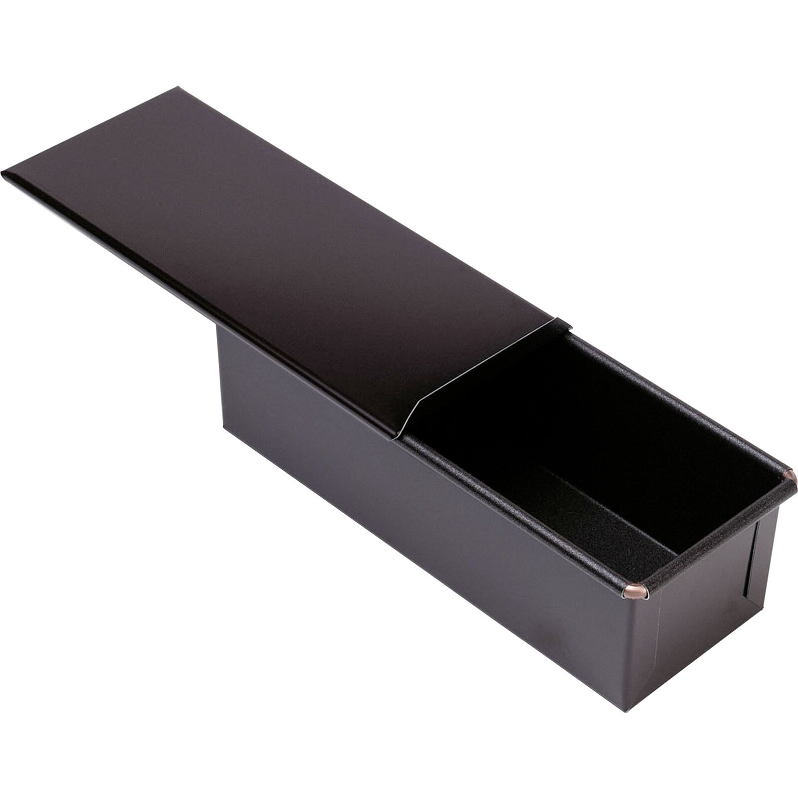 Brotform aus Stahl. Antihaftbeschichtet. Innere Maße: 24,5x8,4cmx7,7cm. Schiebedeckel ist abnehmbar. Spülmaschinengeeignet.