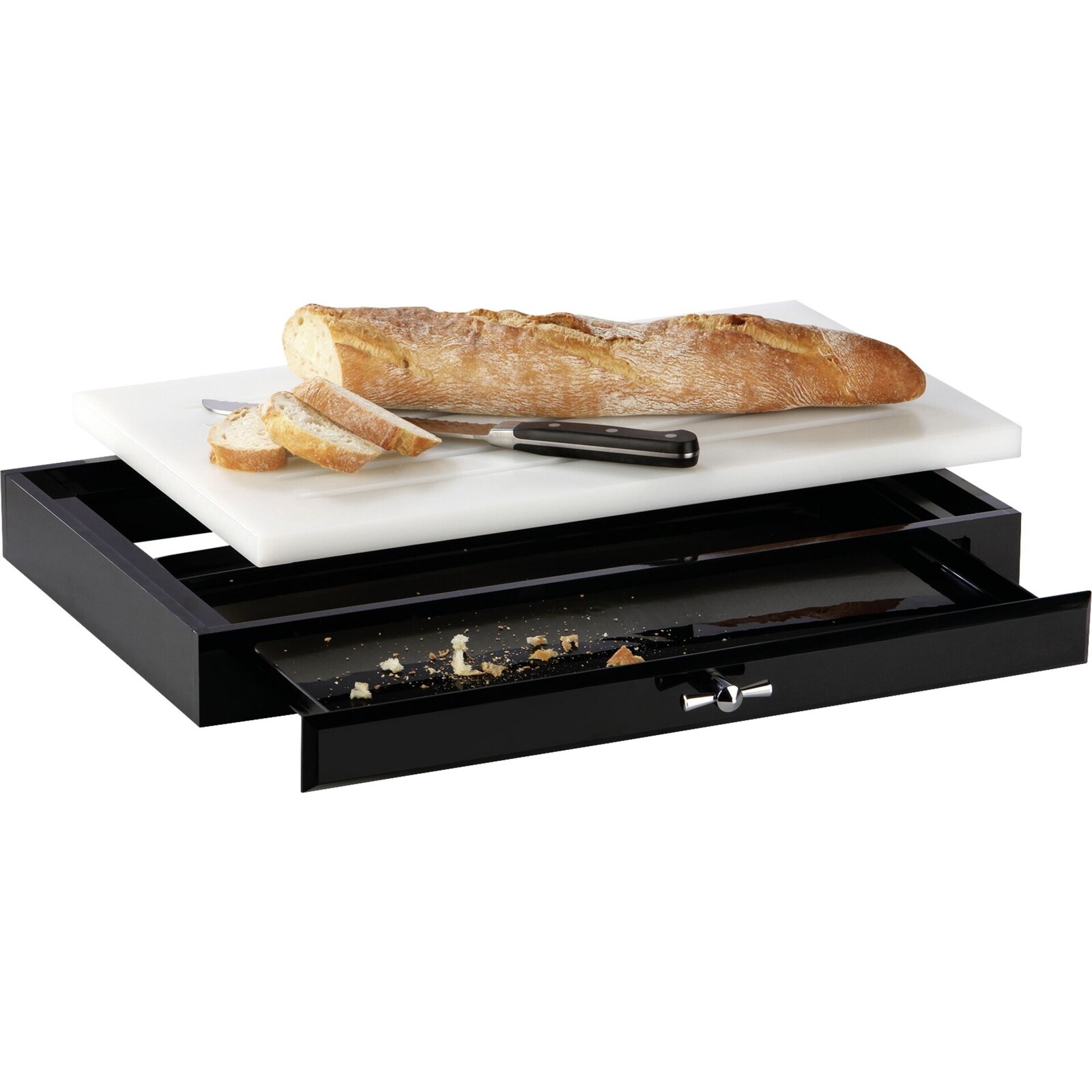 Kasten, Acryl, schwarz, mit herausziehbarer Krümelschublade. Schneidbrett, Acryl, weiß, mit 6 Krümel-Schlitzen. LxBxH in cm: 52,2x32,2x6,5.