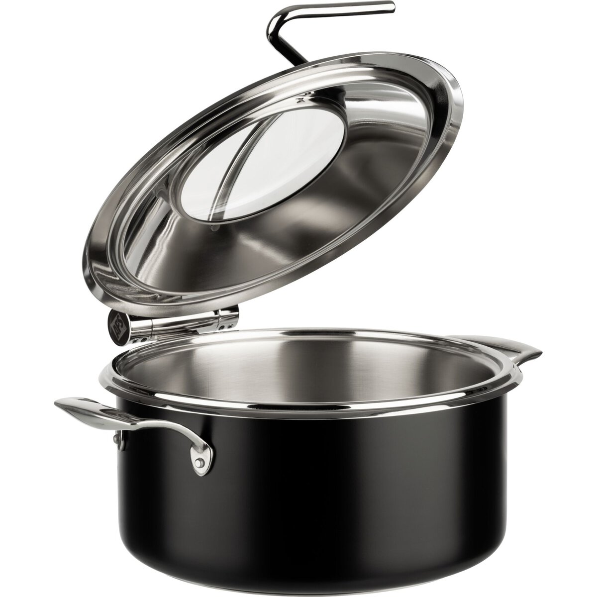 4-teiliges Set bestehend aus: 1 induktionsfähiger Topf (8L), 1 Speisenbehälter (4L), 1 Deckel mit Sichtfenster und Deckelbremse. Passender Speisenbehälter dazu Art. 15374. Edelstahl, schwarz.