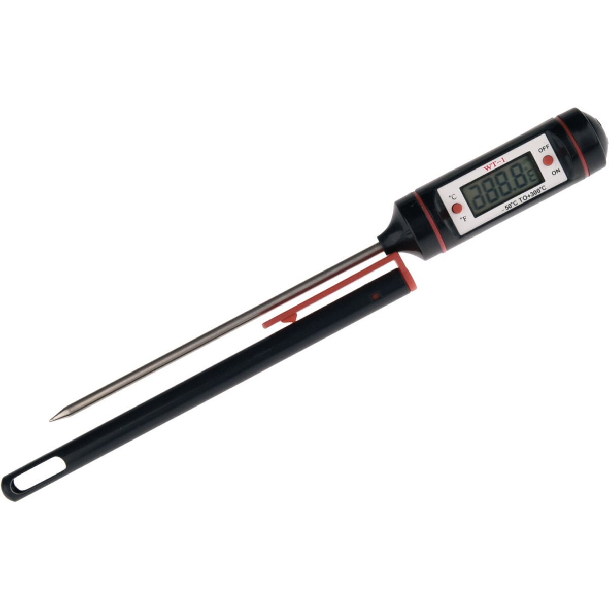 Einstechfühler aus Edelstahl. Inkl. Schutzhülle mit Clip. Einstechtiefe 12,2 cm. Anzeige in °C oder °F. Temperatur-Messbereich: - 50°C bis + 300°C. Auflösung: 0,1°C (bis 100°C), 0,5°C (>100°C).