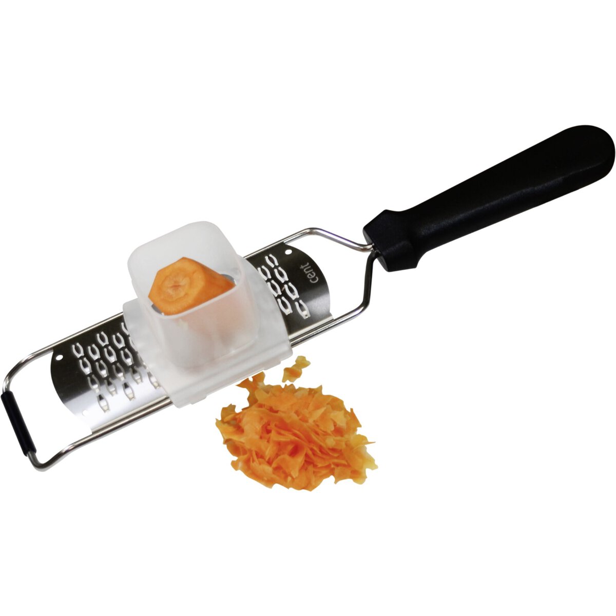 PP, schützt die Finger und ermöglicht ein gefahrloses Reiben auch von sehr kleinen Stücken, spülmaschinengeeignet.