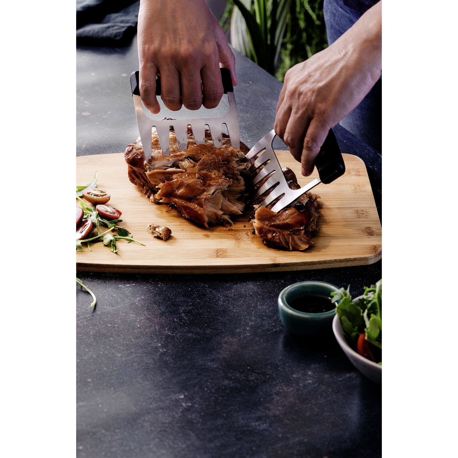 Edelstahl. Ergonomisch geformter schwarzer Kunststoff-Griff für festen u. perfekten Halt. Griffstärke: 2 cm. Je 6 spitze Krallen (Länge: 5 cm) aus Edelstahl zum Greifen und Zerkleinern/Zerreißen von Pulled Pork, Pulled Beef, Braten etc. Auch zum Vermengen von Salaten geeignet. Spülmaschinengeeignet. Im 2er Pack.