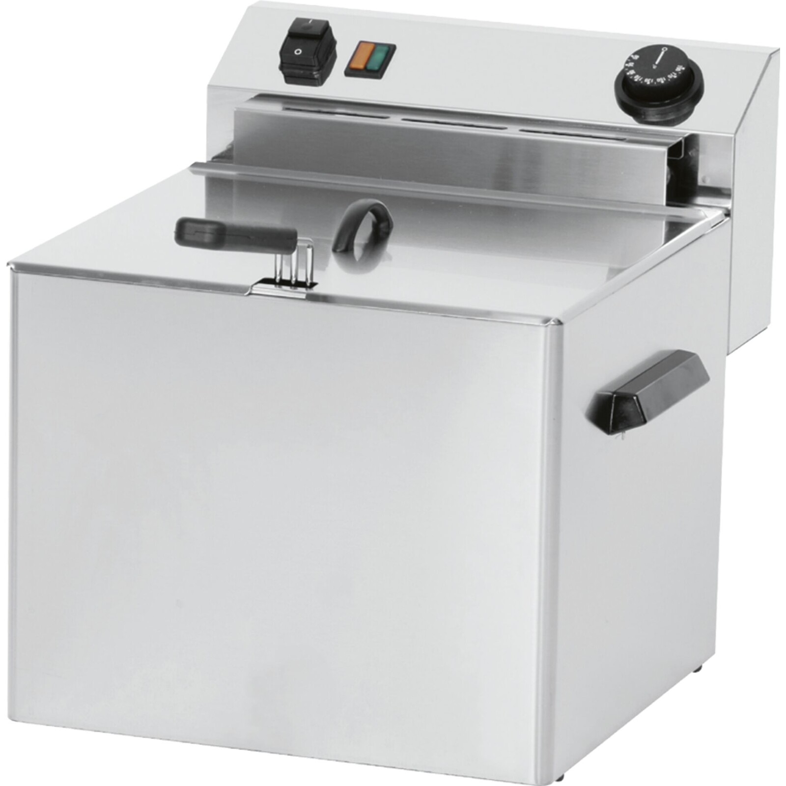 Edelstahl 18/10, rostfrei. Von 50° bis 190°C regelbar. Die Heizung und das Becken sind herausnehmbar. Inklusive Sicherheitsthermostat. Die Fett-Temperatur wird thermostatisch konstant gehalten, so dass ein Überhitzen des Fettes ausgeschlossen ist. Nur flüssiges Fett einfüllen!