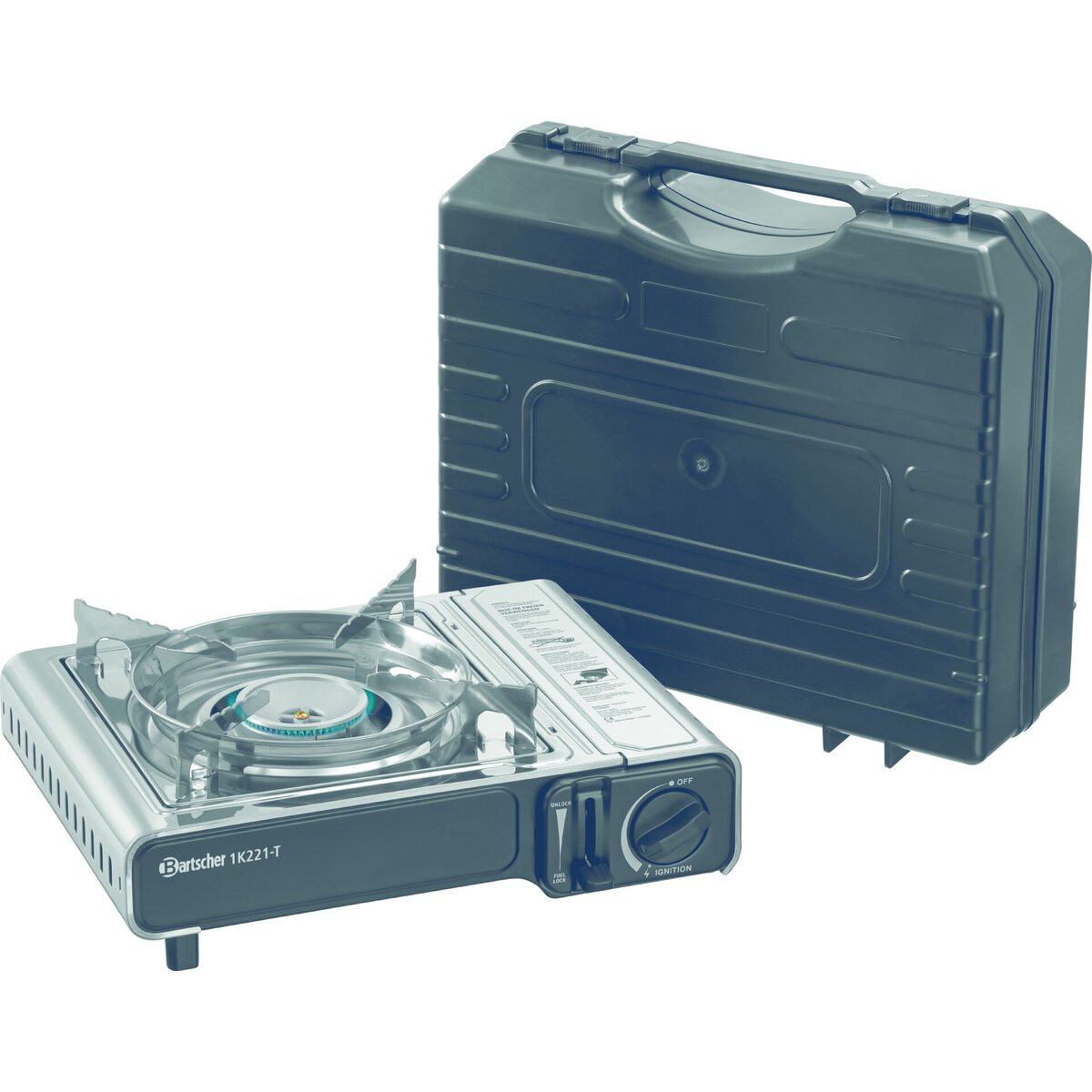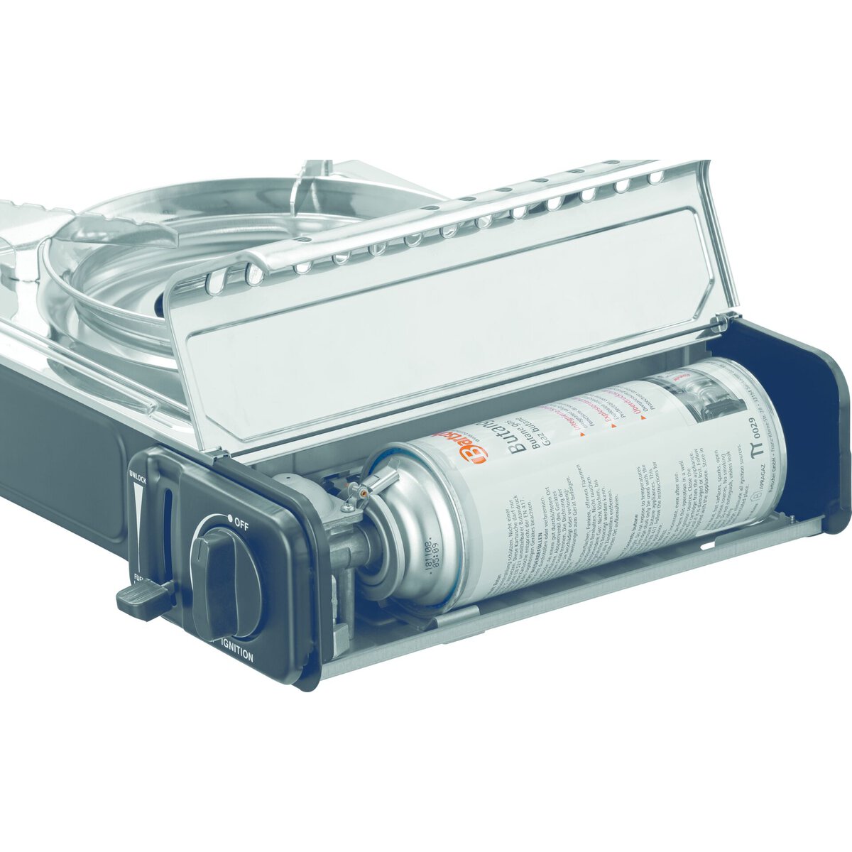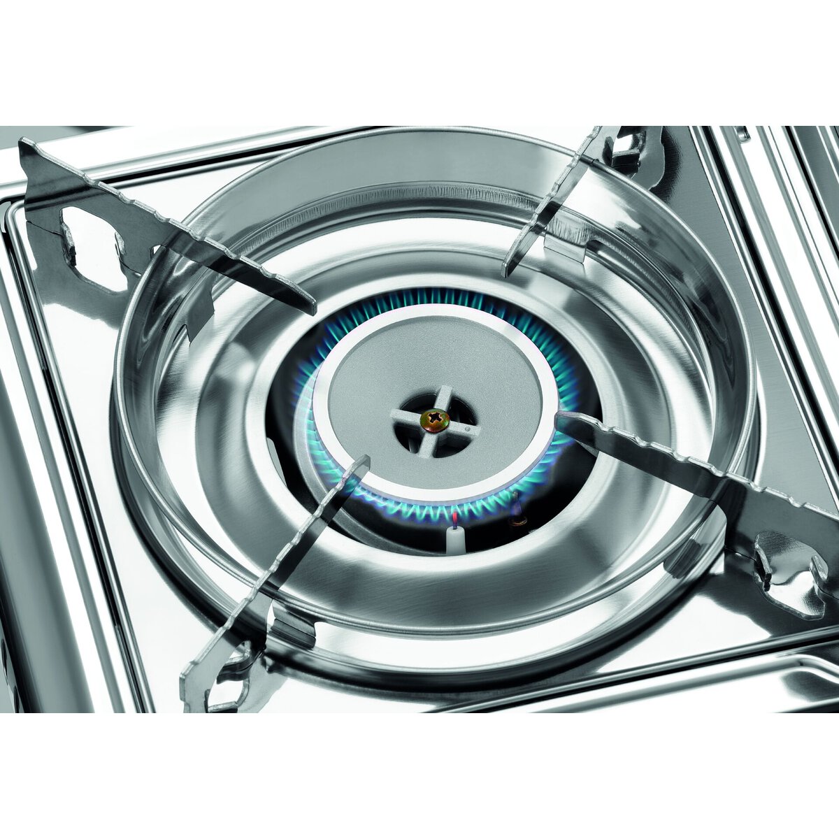 Stahl, silber, 2-stufiges Zündsicherungssystem, thermoelektrisch gesicherte Brenner, für Kochgeschirr Ø 15-27cm, Einkreisbrenner, Piezozündung, im praktischen Transportkoffer, Gasart: Butan, ausschließlich im Außenbereich einsetzbar. Gaskartusche Art. 14580 bitte separat bestellen.