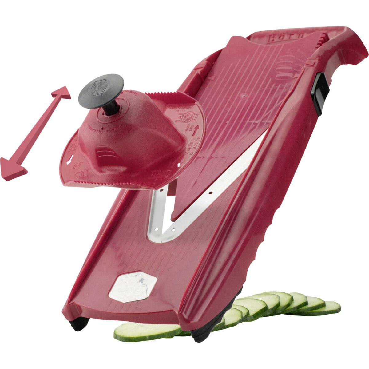 ABS, Klinge Edelstahl. Ergonomischer Griff. Knopf für Schnitthöheneinstellung. Sicherheitsposition für zusätzlichen Schutz. Rutschfeste Gummifüße. Inklusive 3,5mm und 7mm Einschub, Sicherheitsfruchthalter. Schnittstärken von 1,2mm bis 7mm möglich. Verschiedene Möglicheiten, Scheiben, Würfel, Stifte.