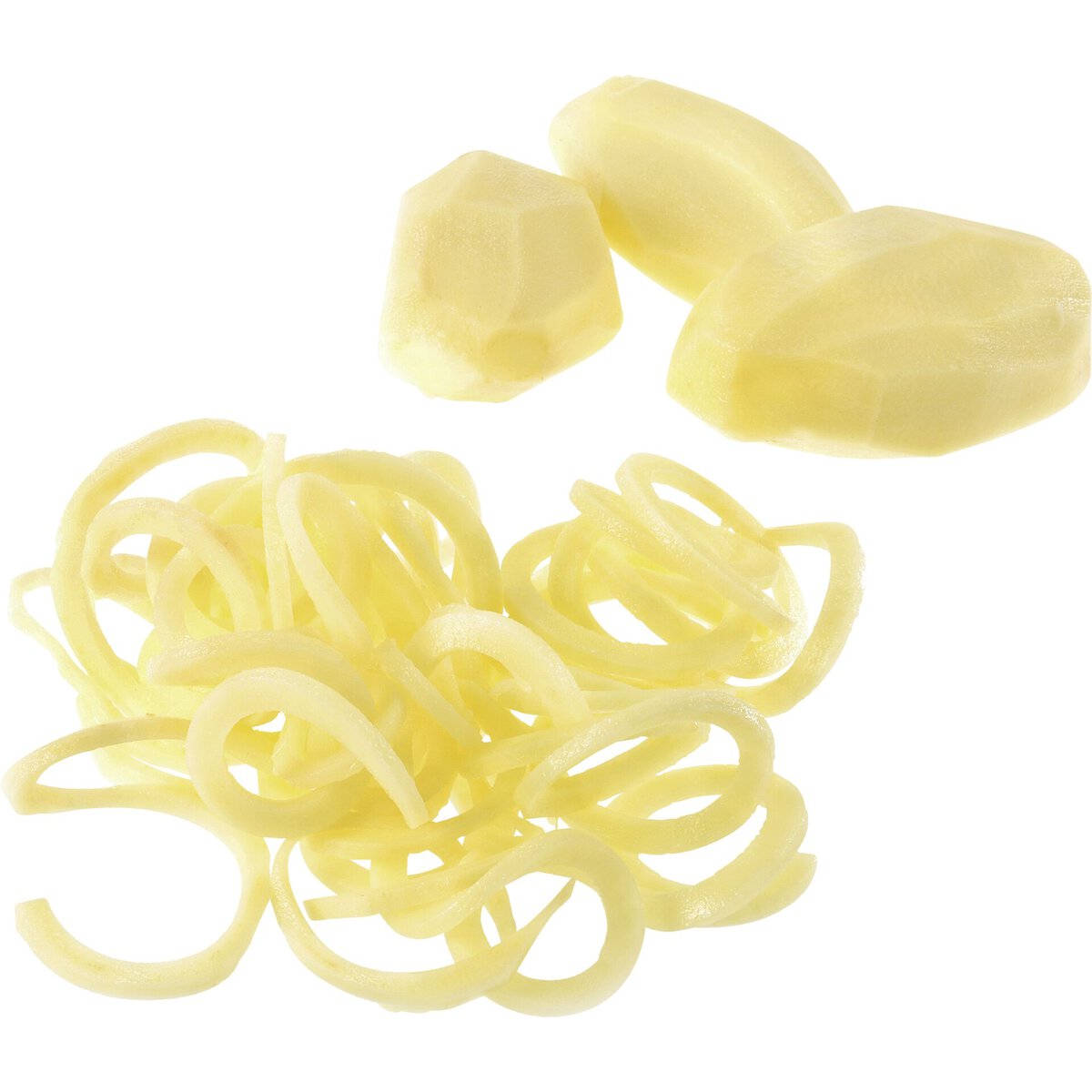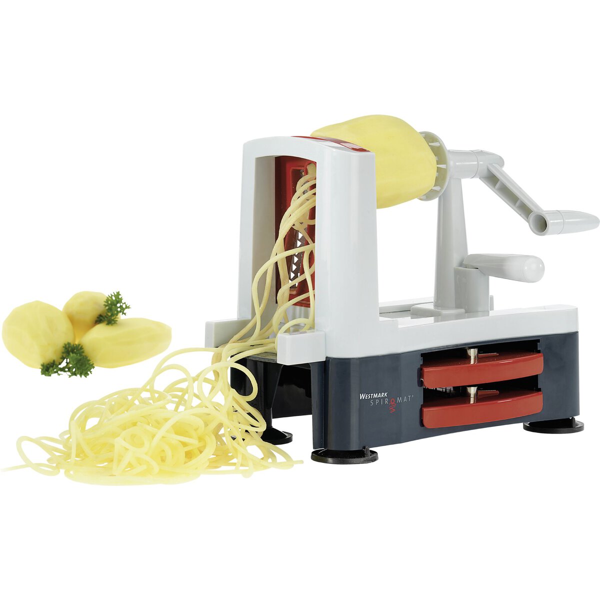 ABS, Edelstahl. Für Obst und Gemüse. 3 sehr scharfe Klingen-Einsätze sorgen für Abwechslung. Praktisch: die jeweils nicht genutzten Schneideinsätze werden schubladenförmig in das Gerät eingesteckt. 4 Gummi-Saugfüße für festen Halt. Spülmaschinengeeignet.