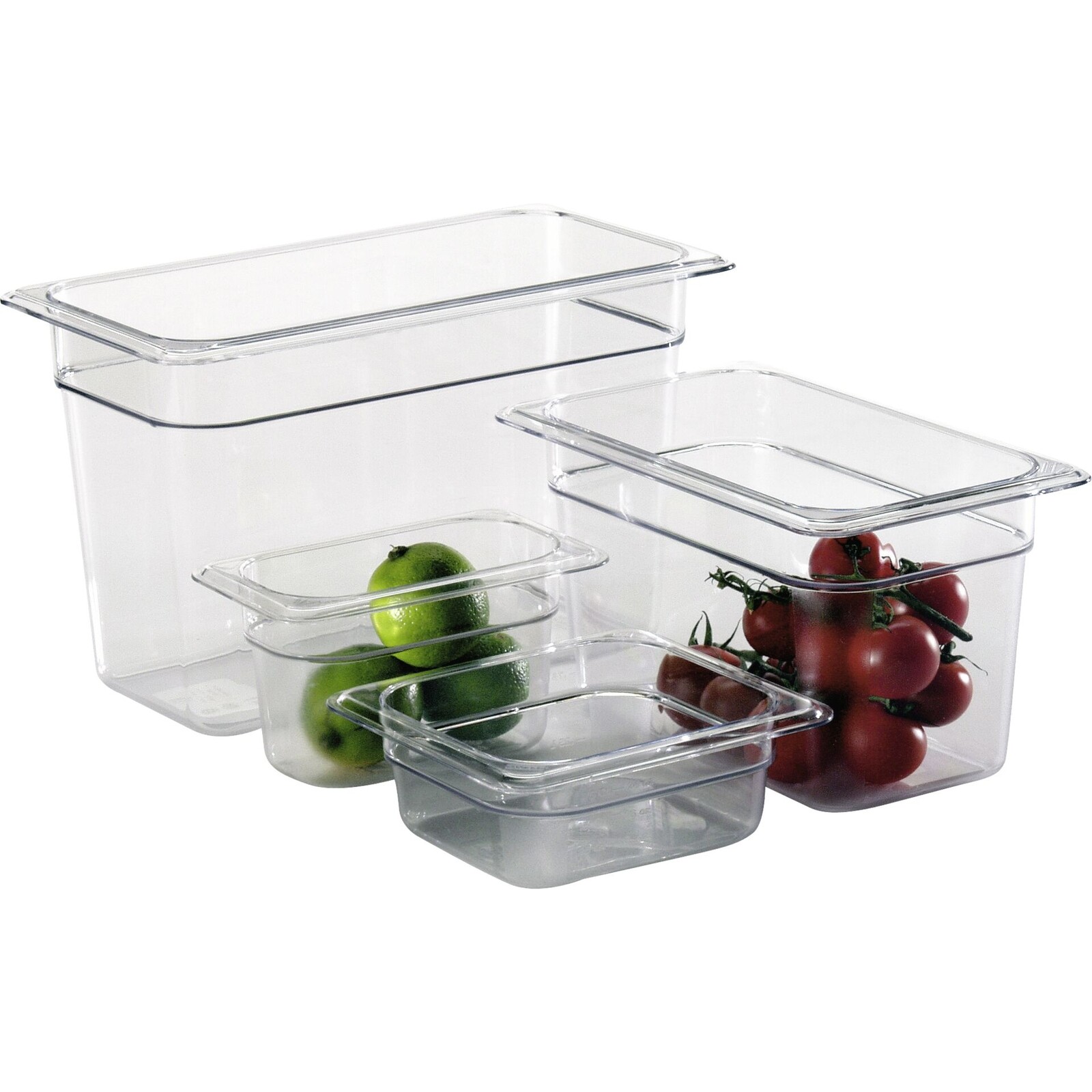Polycarbonat, transparent, stapelbar, bruchsicher, mit Skalierung. Einsetzbar von -40°C bis +100°C. Spülmaschinen- und mikrowellengeeignet. Passende Deckel bitte separat mitbestellen.