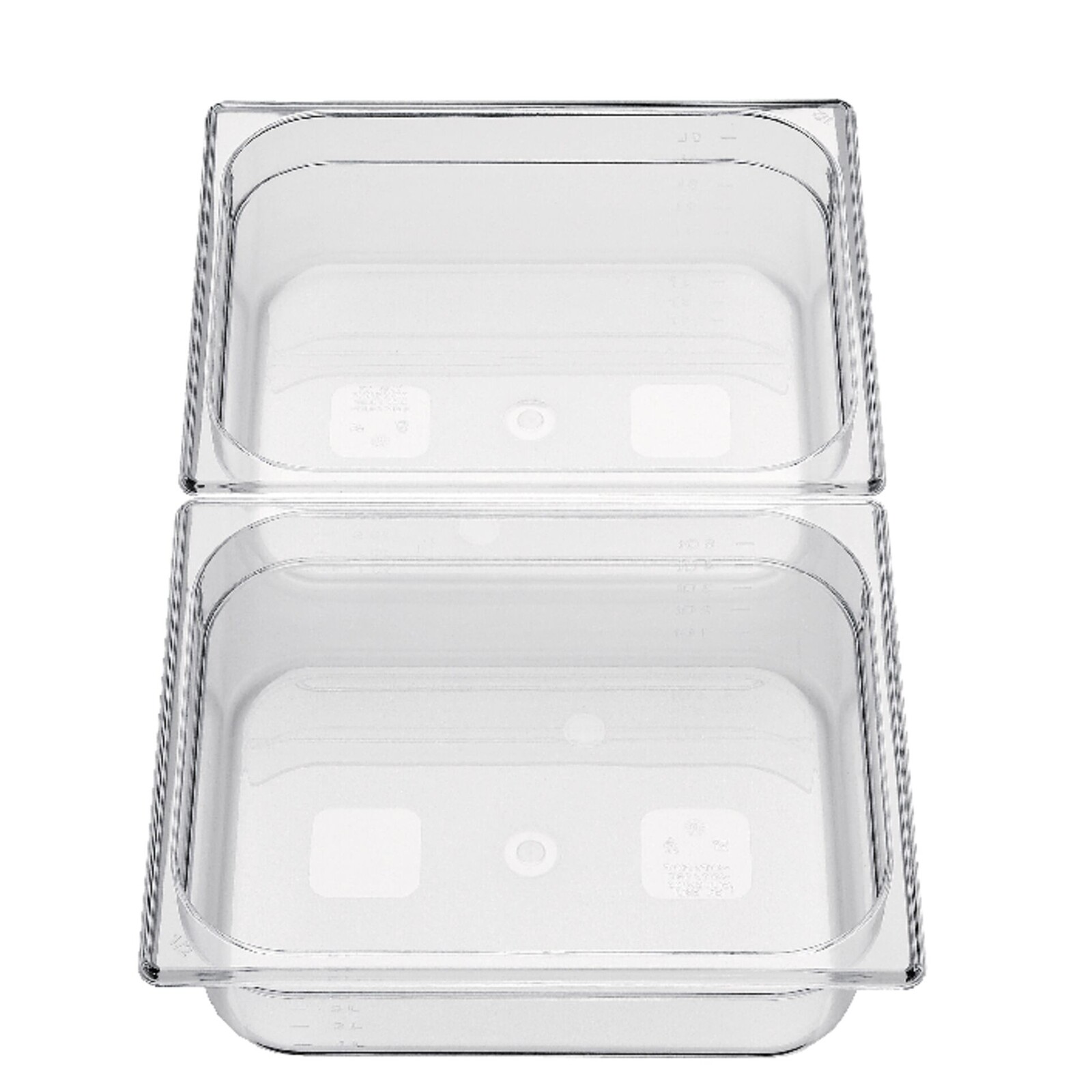 Polycarbonat, transparent, stapelbar, bruchsicher, mit Skalierung. Einsetzbar von -40°C bis +100°C. Spülmaschinen- und mikrowellengeeignet. Passende Deckel bitte separat mitbestellen.