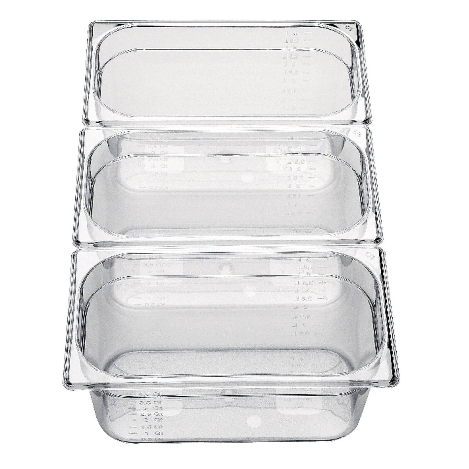 Polycarbonat, transparent, stapelbar, bruchsicher, mit Skalierung. Einsetzbar von -40°C bis +100°C. Spülmaschinen- und mikrowellengeeignet. Passende Deckel bitte separat mitbestellen.