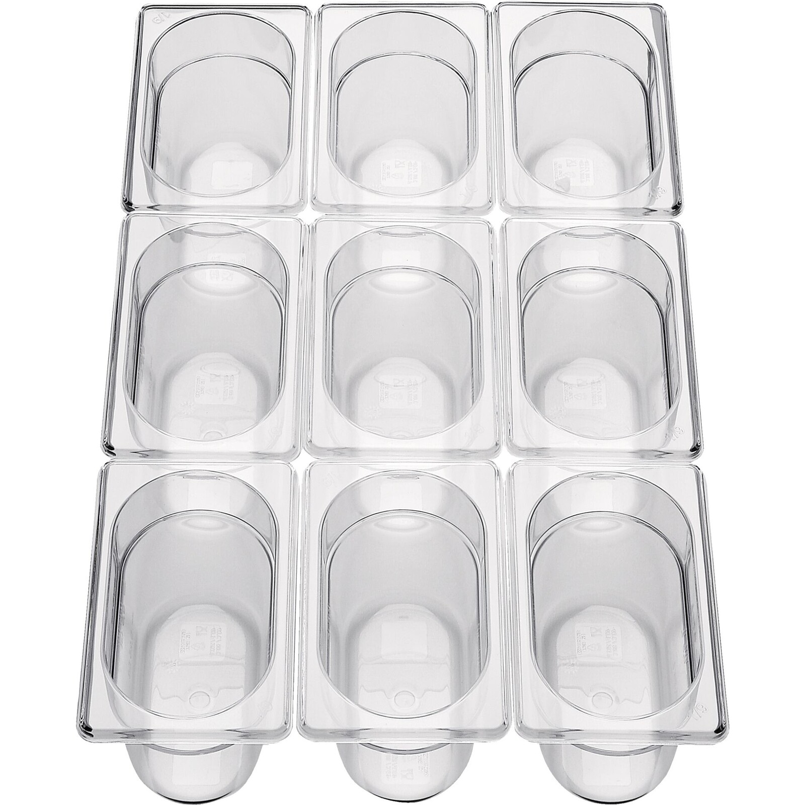 Polycarbonat, transparent, stapelbar, bruchsicher, mit Skalierung. Einsetzbar von -40°C bis +100°C. Spülmaschinen- und mikrowellengeeignet. Passende Deckel bitte separat mitbestellen.