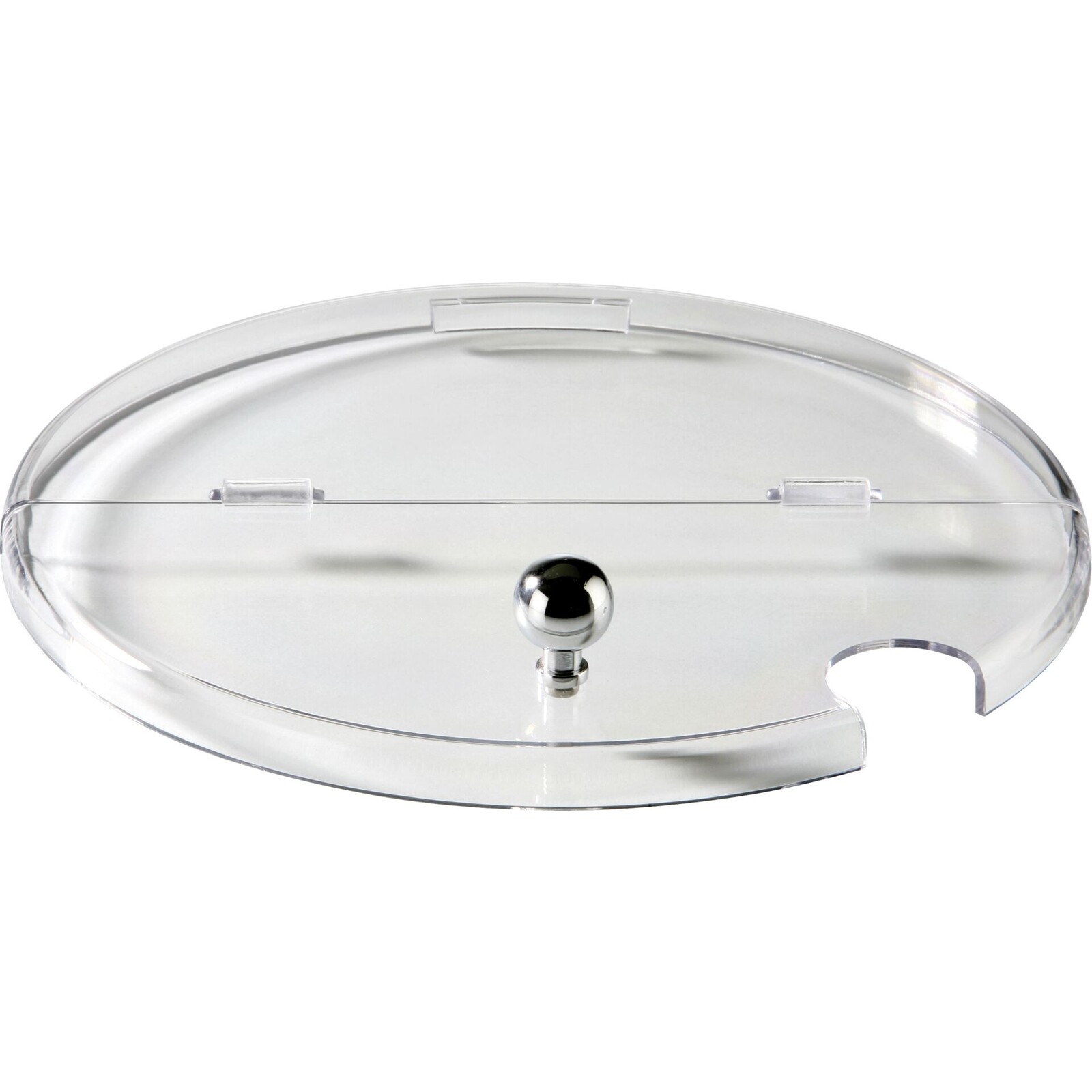 Acryl, klar aufklappbar mit Edelstahlknopf und Löffelaussparung.
