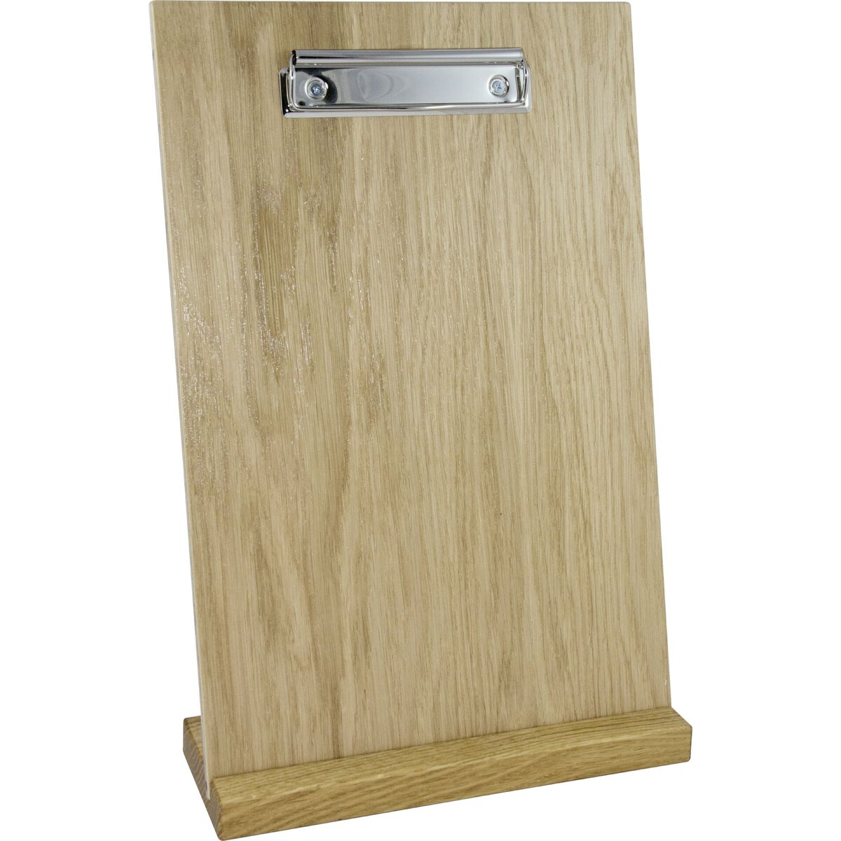 Eichenholz. Mit Klemmleiste. Abgerundete Ecken. Mit dem Speisekarten-Klemmbrett kann ganz einfach die Tageskarte oder Ihr speziell auf den Gast abgestimmtes Menü ausgetauscht werden. Die passende Klemmbretthalterung bitte separat dazu bestellen.