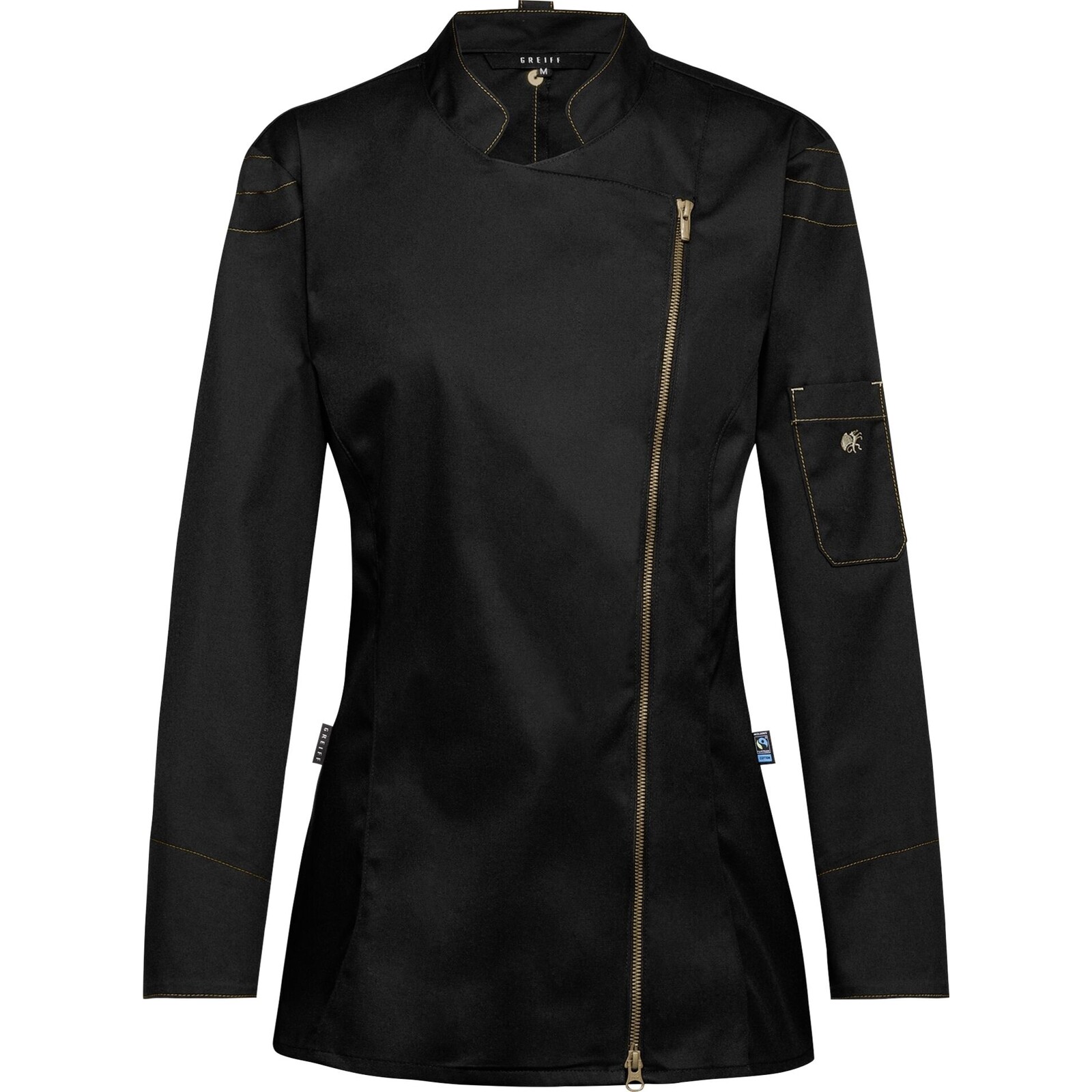 "Cuisine Premium". 49% Baumwolle, 49% Polyester, 2% Elastolefin, 200 g/m², schwarz mit gold-bronzefarbenem Kontrast-Reißverschluss. Regular fit. Elastisch, Stretch. Kontrast-Nähte, Armtasche mit Logo, Armabschluss mit Reißverschluss, Lüftungslöcher. Die gesamte Baumwolle ist Fairtrade zertifiziert. Somit auch Produktion im Fairtrade auditierten Betrieb. Waschen: Normalwaschgang 60°C, Bleichen: nicht bleichen, Trocknen: Trocknen im Tumbler, niedrige Temperatur, 60°C, normaler Trocknungsprozess, Bügeln: Bügeln mit einer Höchsttemperatur der Bügeleisensohle von 150°C, Reinigen: professionelle Trockenreinigung, normaler Prozess.
