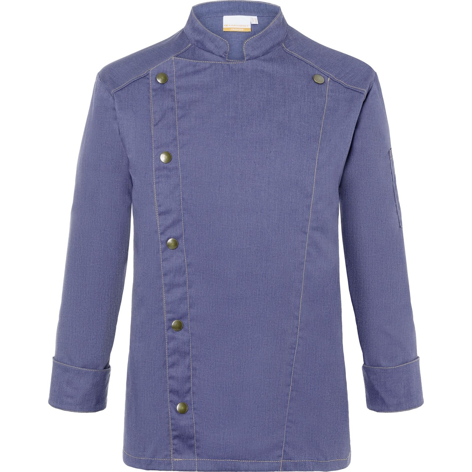 Farbe: Vintage blue. Trendige Kochjacke in Jeans-Optik mit schlanker Silhouette. Kontrastfarbige Steppnähte für den originalen Jeans-Look. Asymmetrisch geschlossene, einreihige 5-Knopf-Jacke mit Druckknöpfen zum schnellen Öffnen und Schließen. Ärmelmanschetten mit Schlitz. Aufgesetzte Ärmeltasche links mit praktischem Stiftfach. Industriewäschetauglich (95°C). 65% Polyester/ 35% Baumwolle. Köpergewebe, 195 g/m². Hochveredelt, gekrumpft, waschecht, pflegeleicht.