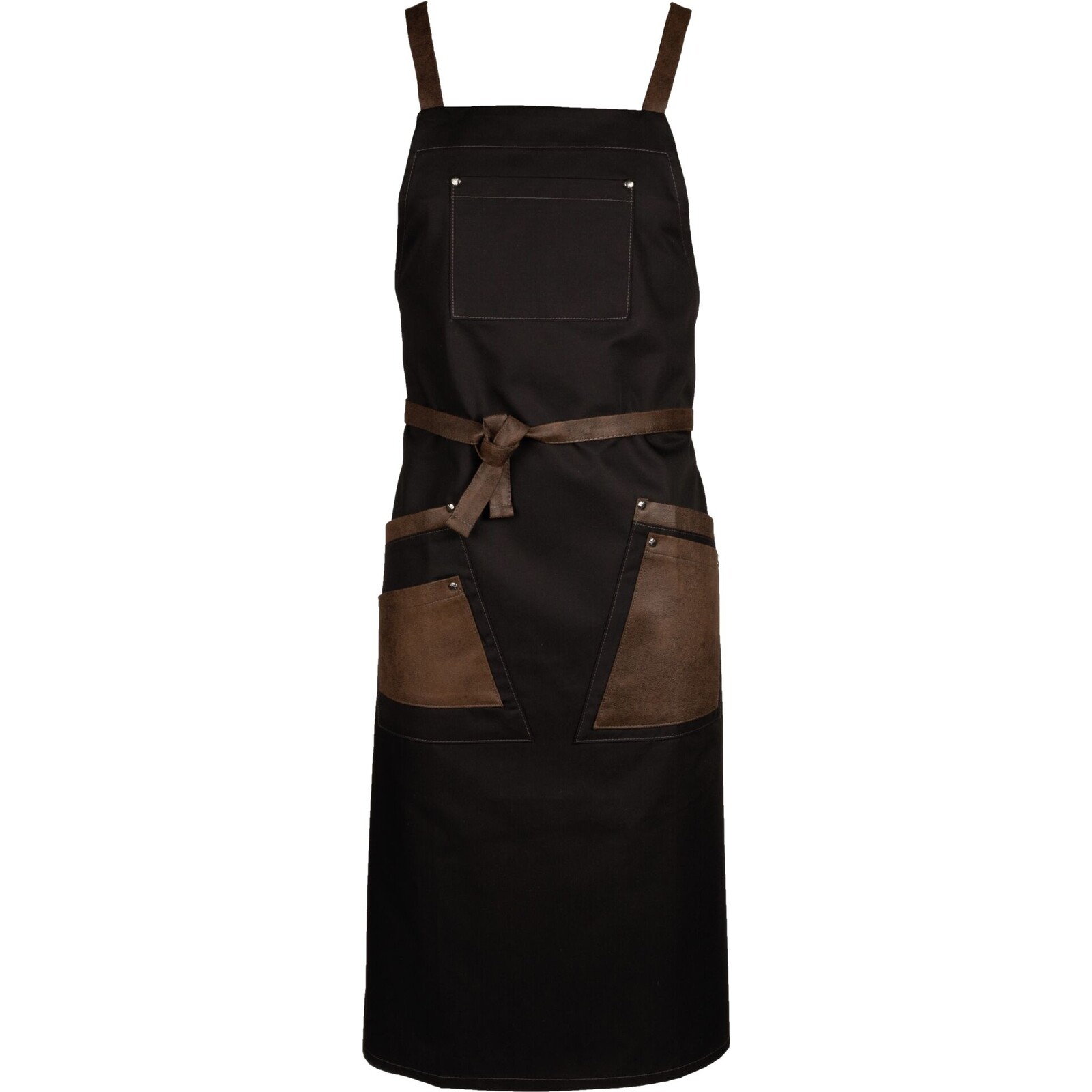 Stoff (schwarz) und Kunstleder (braun), 65% Polyester / 35% Baumwolle. Waschbar bis 60° C. Jeweils 2 Doppeltaschen in Hüfthöhe. Taschen links LxB in cm: 26/21,5x16,5 und 19/15,5x14. Taschen rechts LxB in cm: 26/21,5x16,5 und 13/9,5x13,5. Latzschürze: Brusttasche LxB in cm 14x17. Gekreuzte Träger im Rücken sind in der Länge verstellbar. Bistroschürze: Gehschlitzhöhe 40 cm.