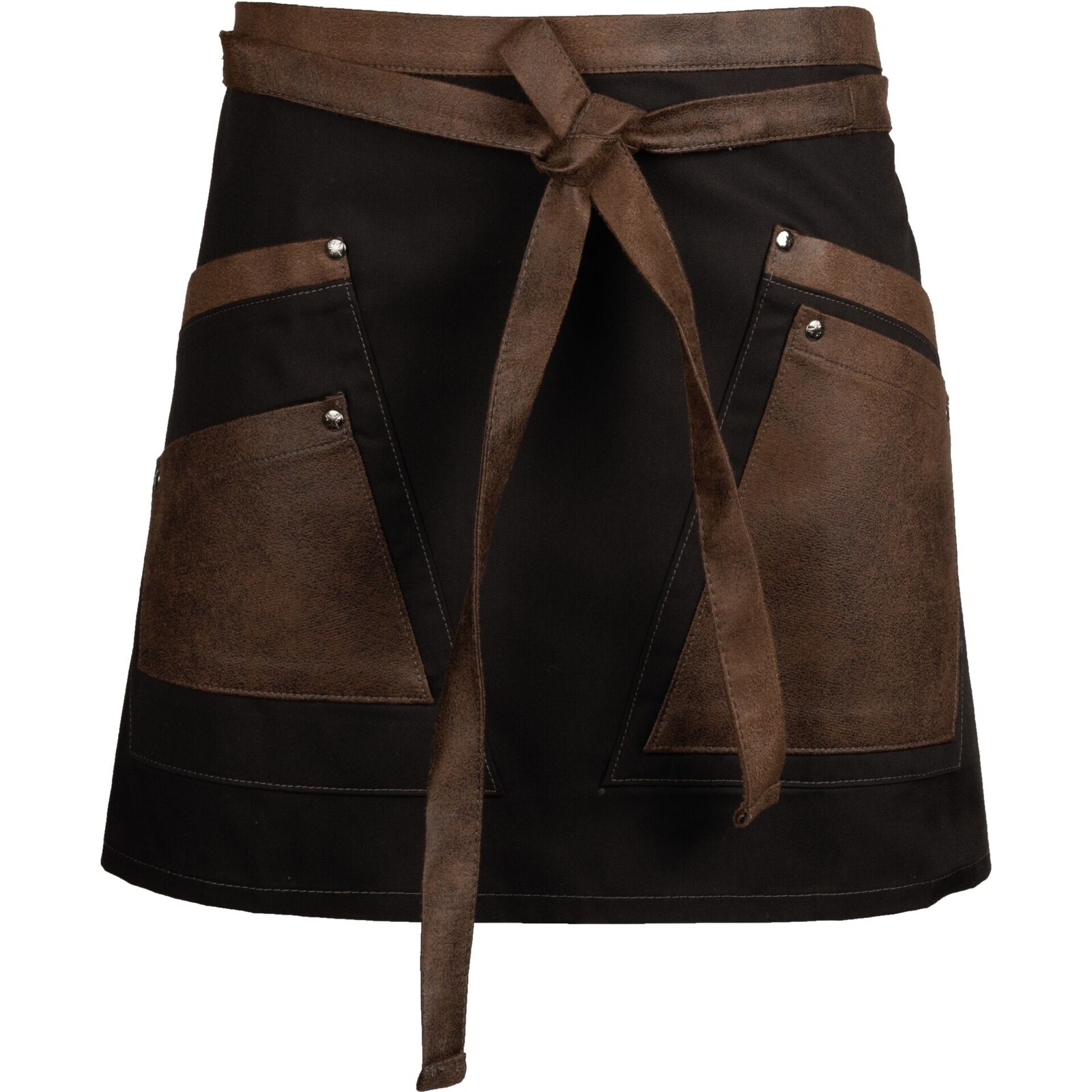 Stoff (schwarz) und Kunstleder (braun), 65% Polyester / 35% Baumwolle. Waschbar bis 60° C. Jeweils 2 Doppeltaschen in Hüfthöhe.