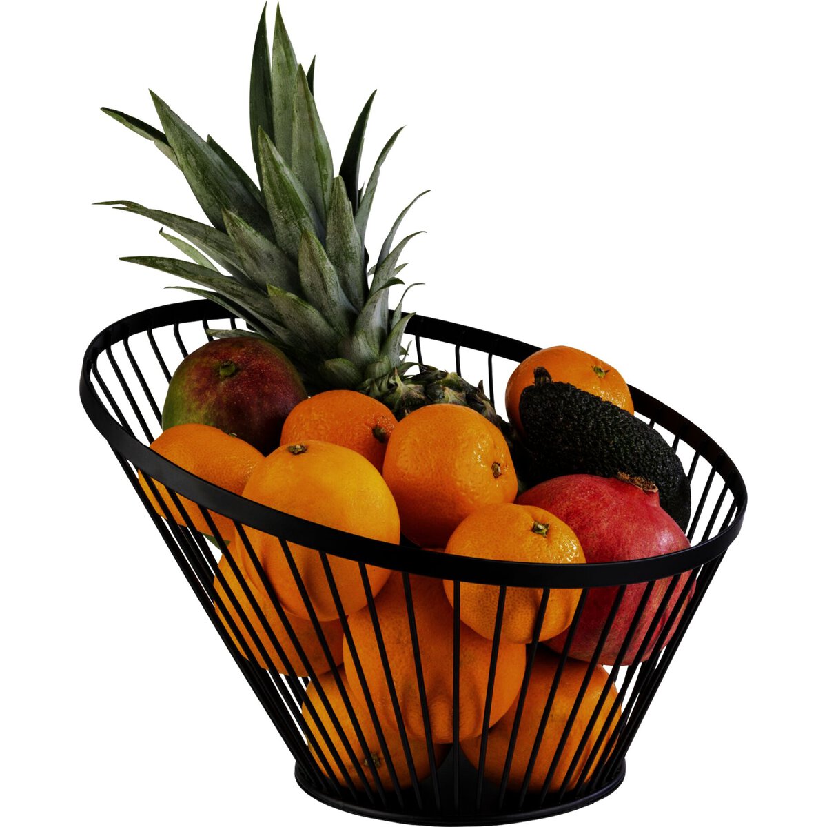 Stahl, schwarz. Mit lebensmittelechter Beschichtung. Ideal für Brot, Obst u. Gemüse. Abgeschrägte Form: Ø oben 30cm, H hinten 20,5cm, H vorne 13cm. Handwäsche empfohlen.