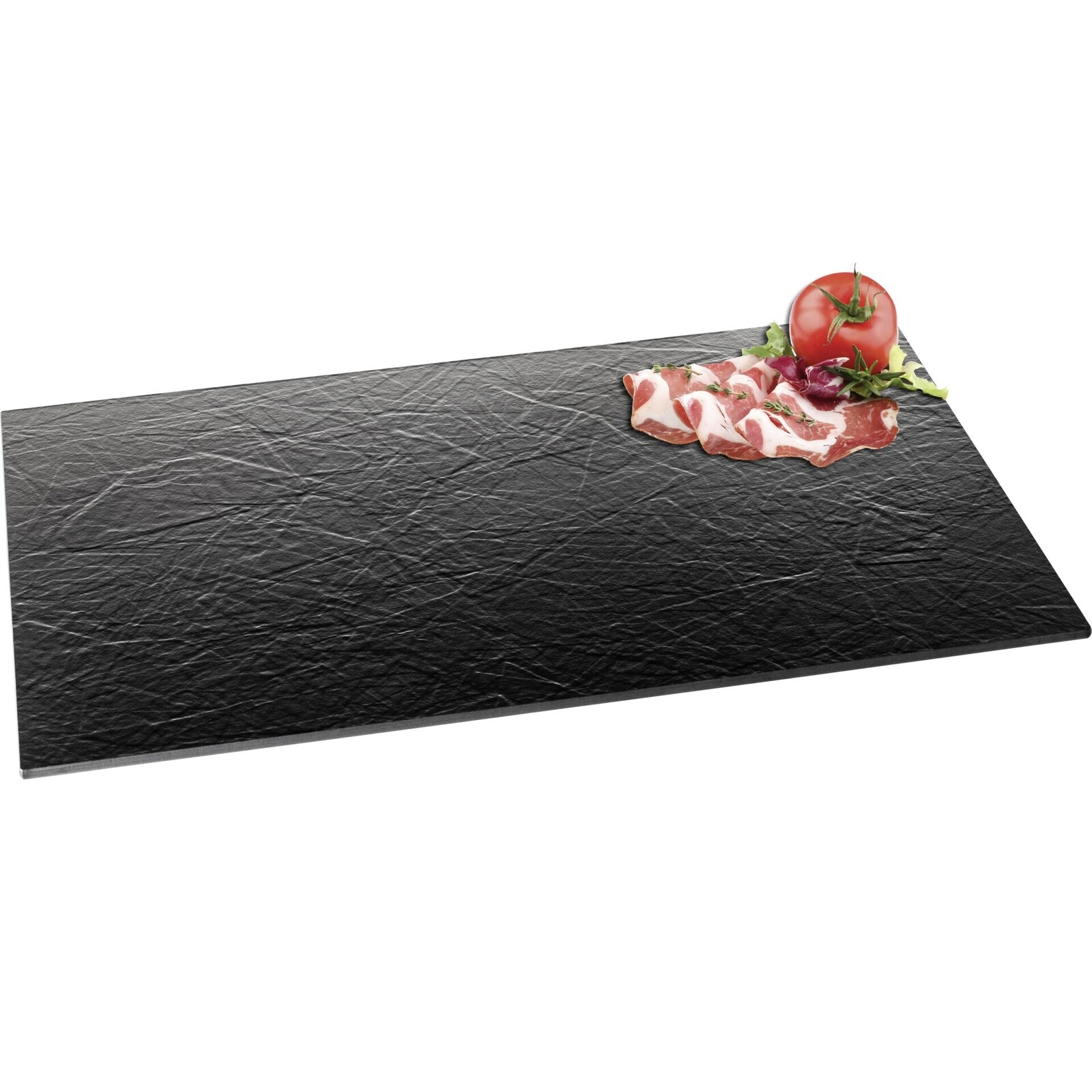 Kunstschiefer. Mit Antirutsch-Gummifüßchen. Lebensmittelunbedenklich, bruch- und kratzfest, geringes Gewicht, spülmaschinengeeignet, hitzefest bis 160°C (nicht für Backofen geeignet).