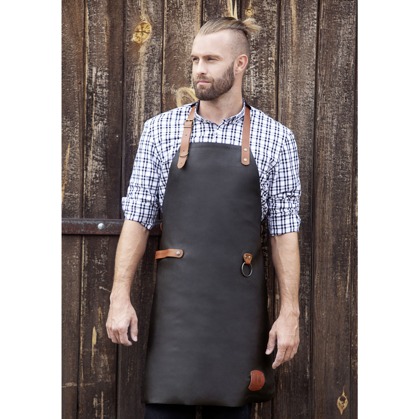 Stylische Lederschürze aus angenehm leichtem und schmiegsamen Rindsleder. 100 % handgearbeitetes Naturprodukt. Farbig abgesetzte Lederapplikationen und bronzierte Metallnieten. Nicht bügeln, nicht waschmaschinengeeignet.