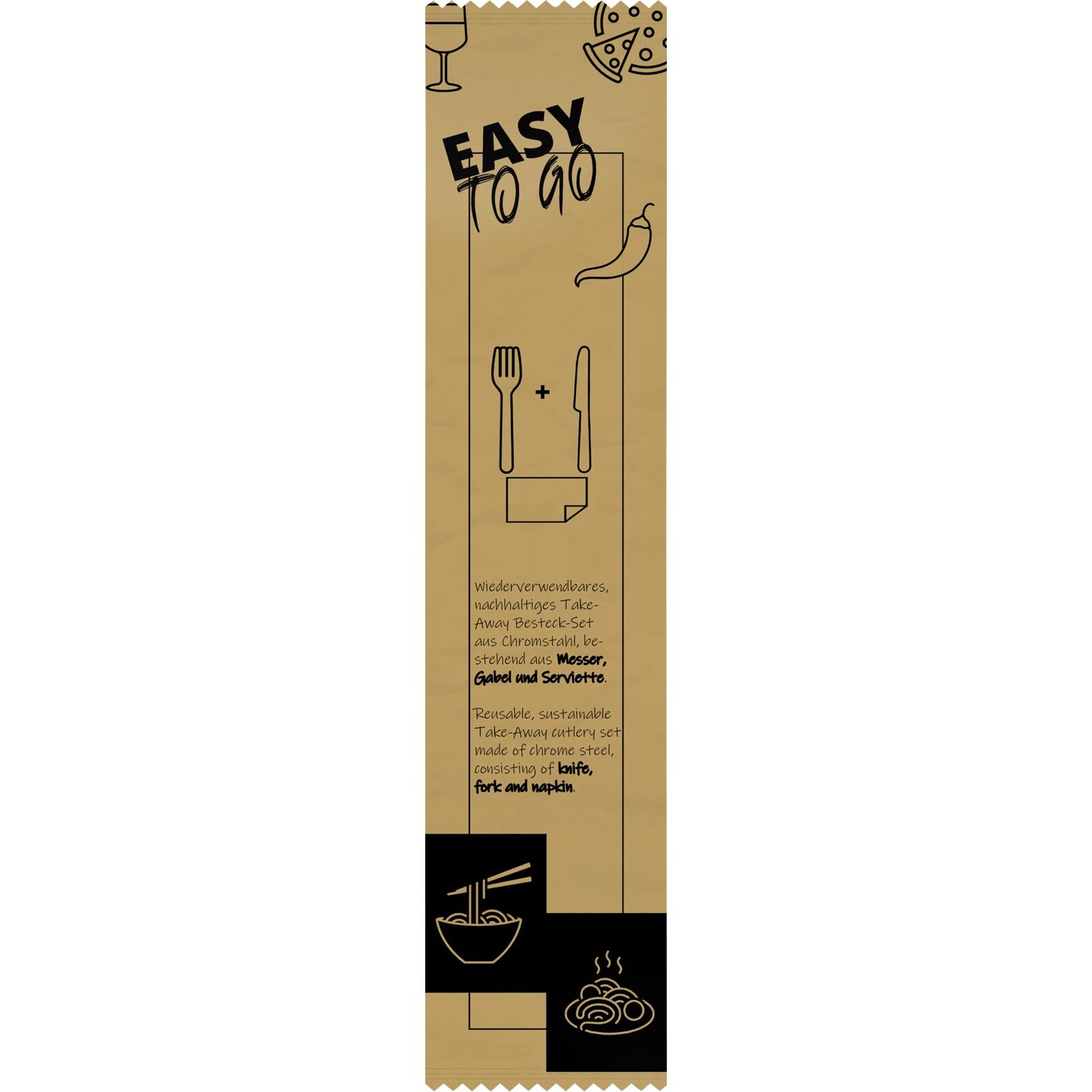 Wiederverwendbares, nachhaltiges Take-Away Besteck-Set aus Chromstahl 18/0. Bestehend aus Messer, Gabel und Serviette. Vorgespült und somit direkt einsatzbereit. Hygienisch, lebensmittelecht, umweltfreundlich, recycelbar und spülmaschinengeeignet.