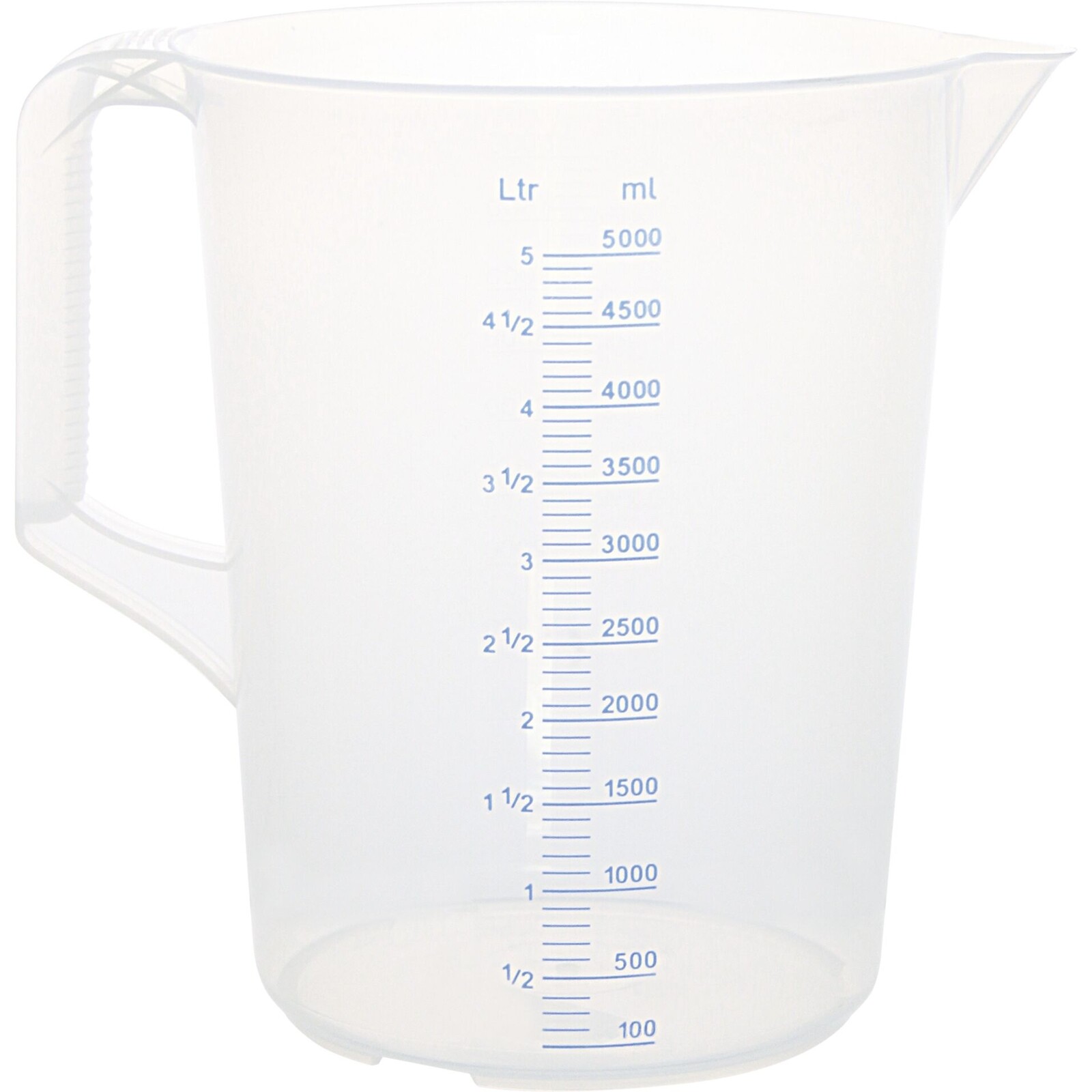 Kunststoff PP, transparent, geprägte Skala und blauer Skaladruck, Liter- und Millilitereinteilung.