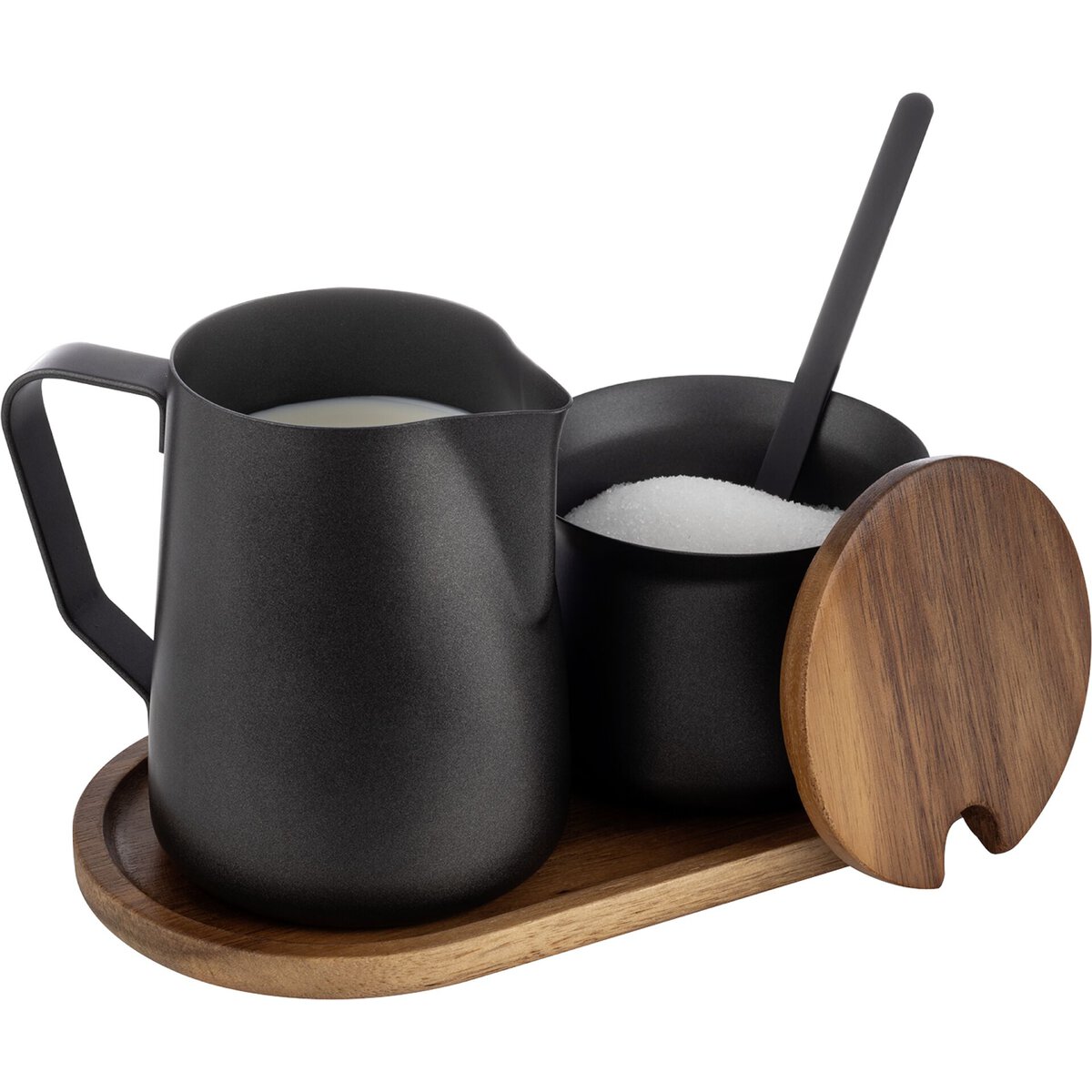 Tablett aus Akazienholz, LxBxH in cm: 19x10x1,5 cm. Milchkanne aus Edelstahl, schwarz PTFE beschichtet, ØxH in cm: 7,8x10 cm, Inhalt: 375 ml. Zuckerdose aus Edelstahl, schwarz PTFE beschichtet, mit Deckel aus Akazienholz, ØxH in cm: 7,8x6,7 cm, Inhalt: 220 ml. Löffel aus Edelstahl, schwarz PTFE beschichtet, L: 13,4 cm. Nicht spülmaschinengeeignet.