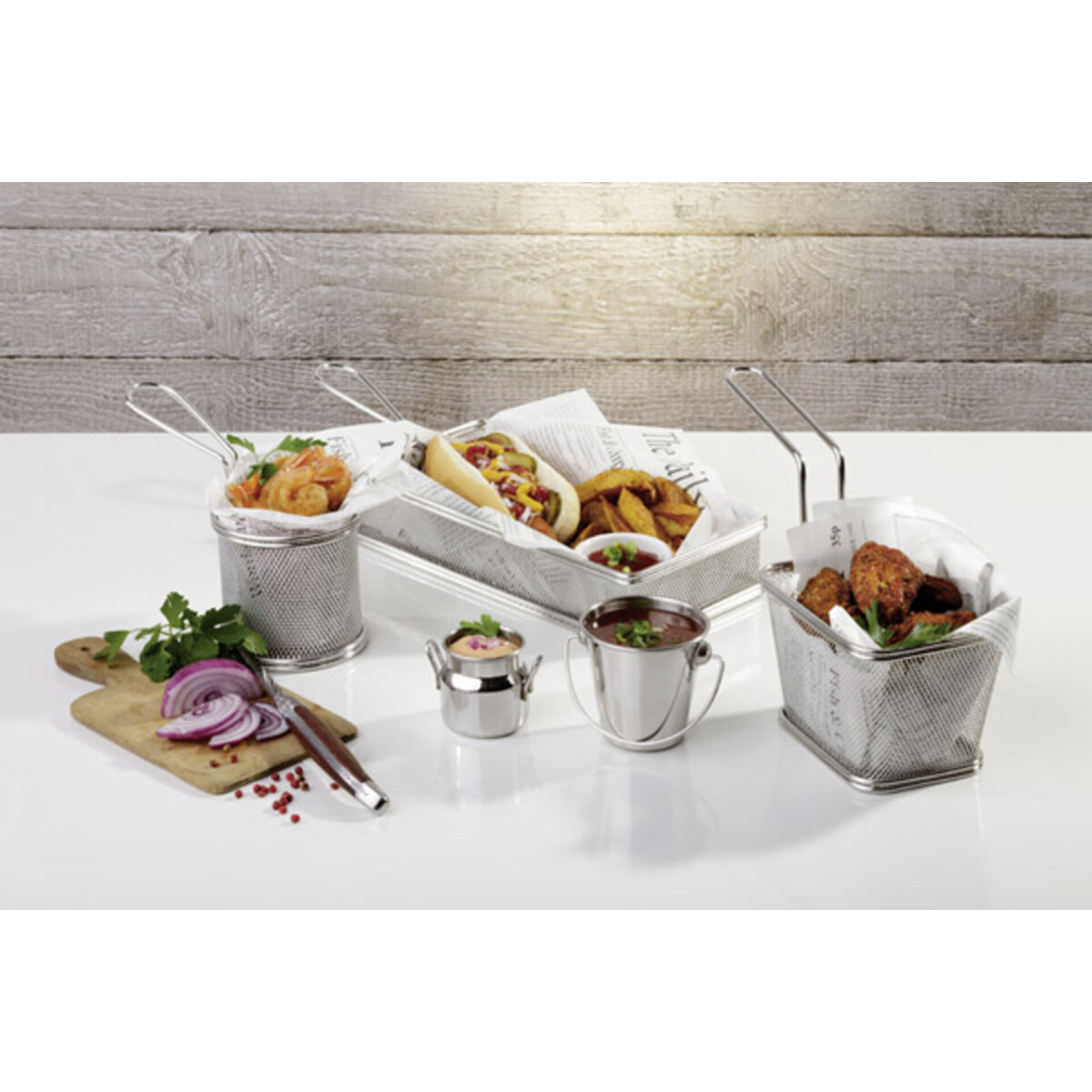Edelstahl, rostfrei. Die originelle Mini-Edelstahlkörbchen zum Servieren von Beilagen und Snacks. Stapelbar. Spülmaschinengeeignet.
