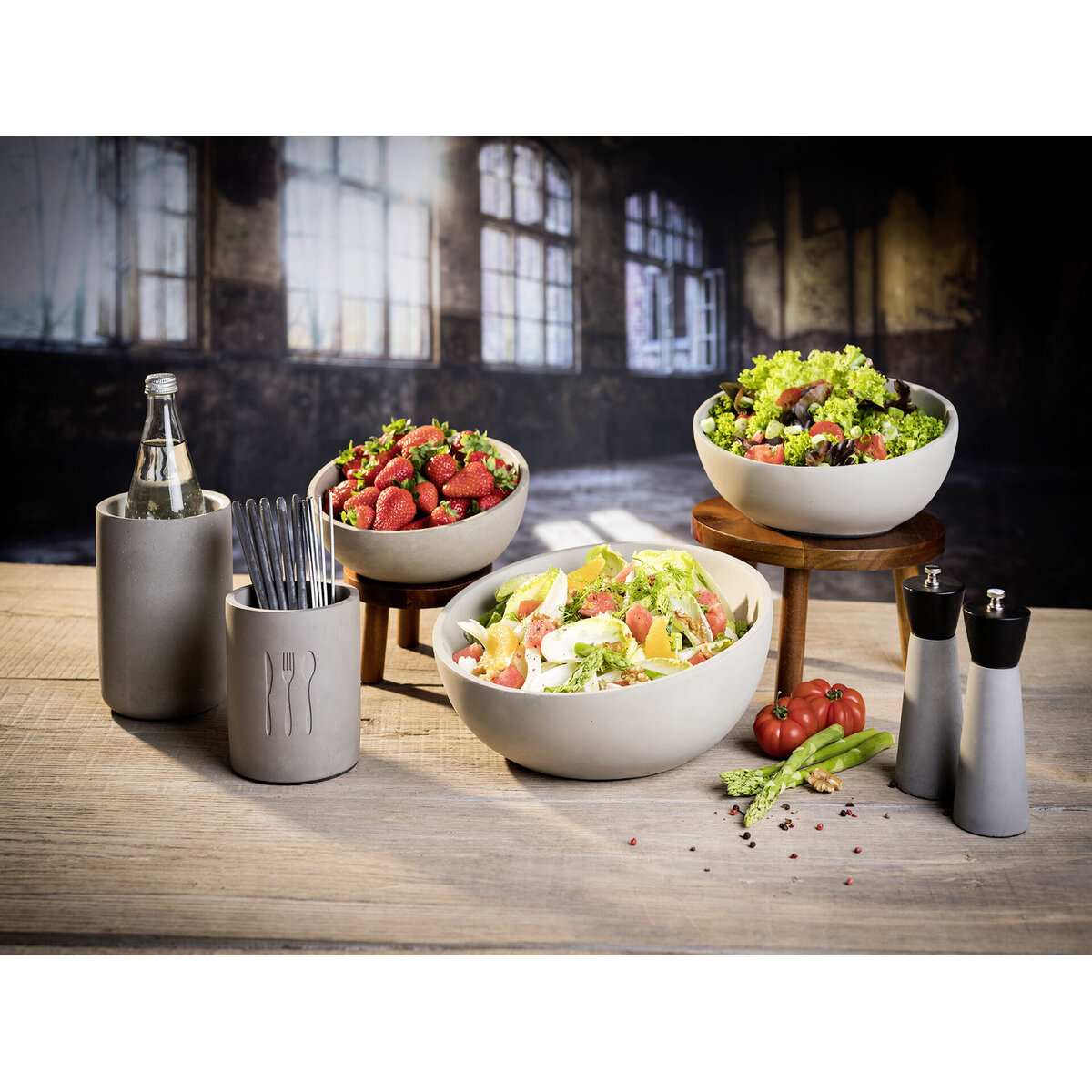 Korpus aus Beton, Kopf aus Buchenholz gefertigt. Stufenlos einstellbarer Mahlgrad. Ø 6,0 x Höhe: 18,0 cm. Nicht spülmaschinengeeignet. Farbe: grau/ schwarz.