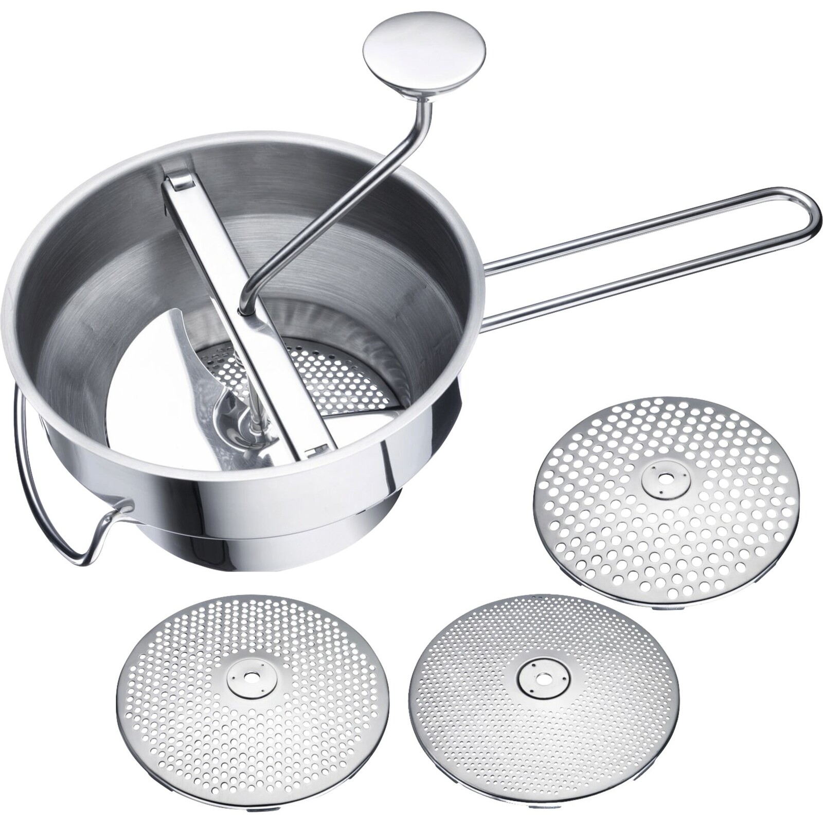 Material: Edelstahl, stabile Qualität, mit 3 Lochscheiben in 1,3 mm, 3 mm u. 5 mm, zum Entsaften/ Pürieren von Obst und Gemüse, ideal auch für die Herstellung von Babynahrung, spülmaschinengeeignet.