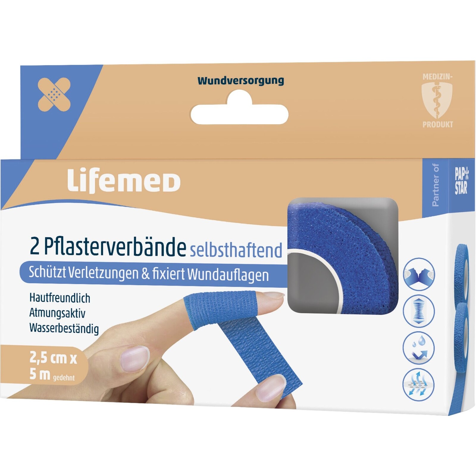 Selbstklebendes (kohäsives) Pflaster. Polyester, blau, LxB: 5m 2,5cm. Nur auf sich selbst haftend, kein Verkleben der Haut, Haare oder Wunden. Hautverträglich, auch bei Pflasterallergie anwendbar. Hält auch sicher bei Kontakt mit Feuchtigkeit. Ideal für den Einsatz nach HACCP. Im 2er Pack.