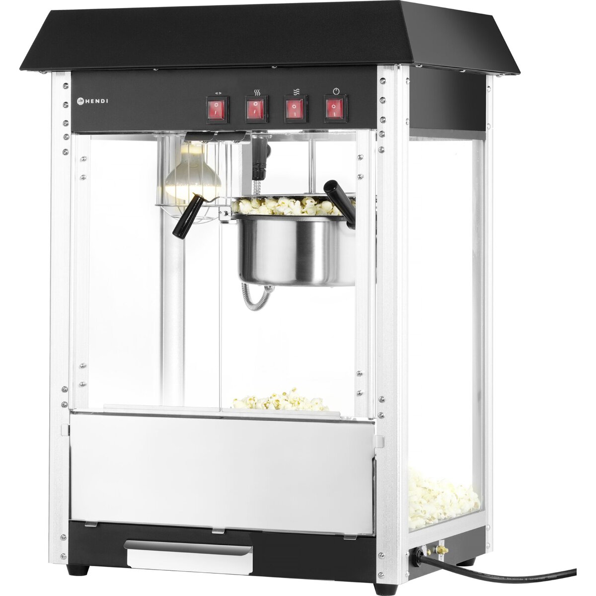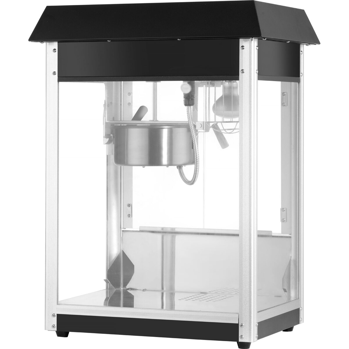 Gestell aus Aluminiumlegierung. Schwarz. Robustes Gehäuse aus gehärtetem Glas und pulverbeschichtetem Stahl. Mit Flügeltür aus gehärtetem Glas. Ein im Topf integriertes Mischsystem. Topfdeckelgriffe aus hitzebeständigem Kunststoff. Klappe zum Entfernen von Popcorn. Schublade unter dem Fach zum einfachen Entfernen von Krümeln und Körnerresten. Beleuchteter Innenraum. Beheizter Kammerboden. Dauer eines Zyklus: ca. 2. Minuten. - 150 g Maiskörner pro Zyklus.