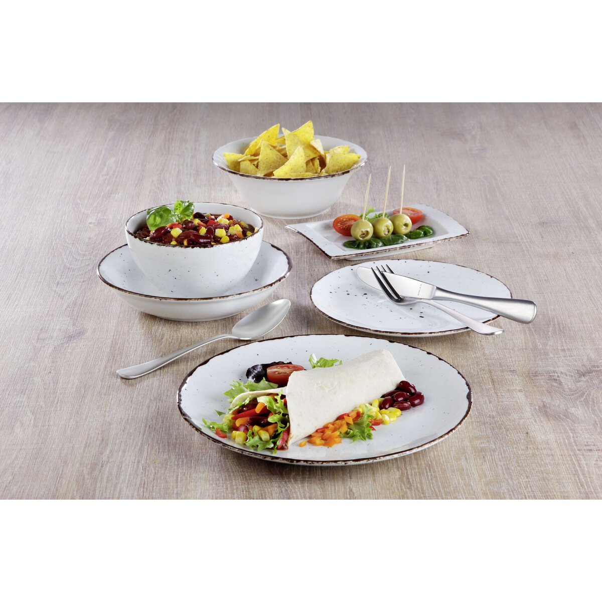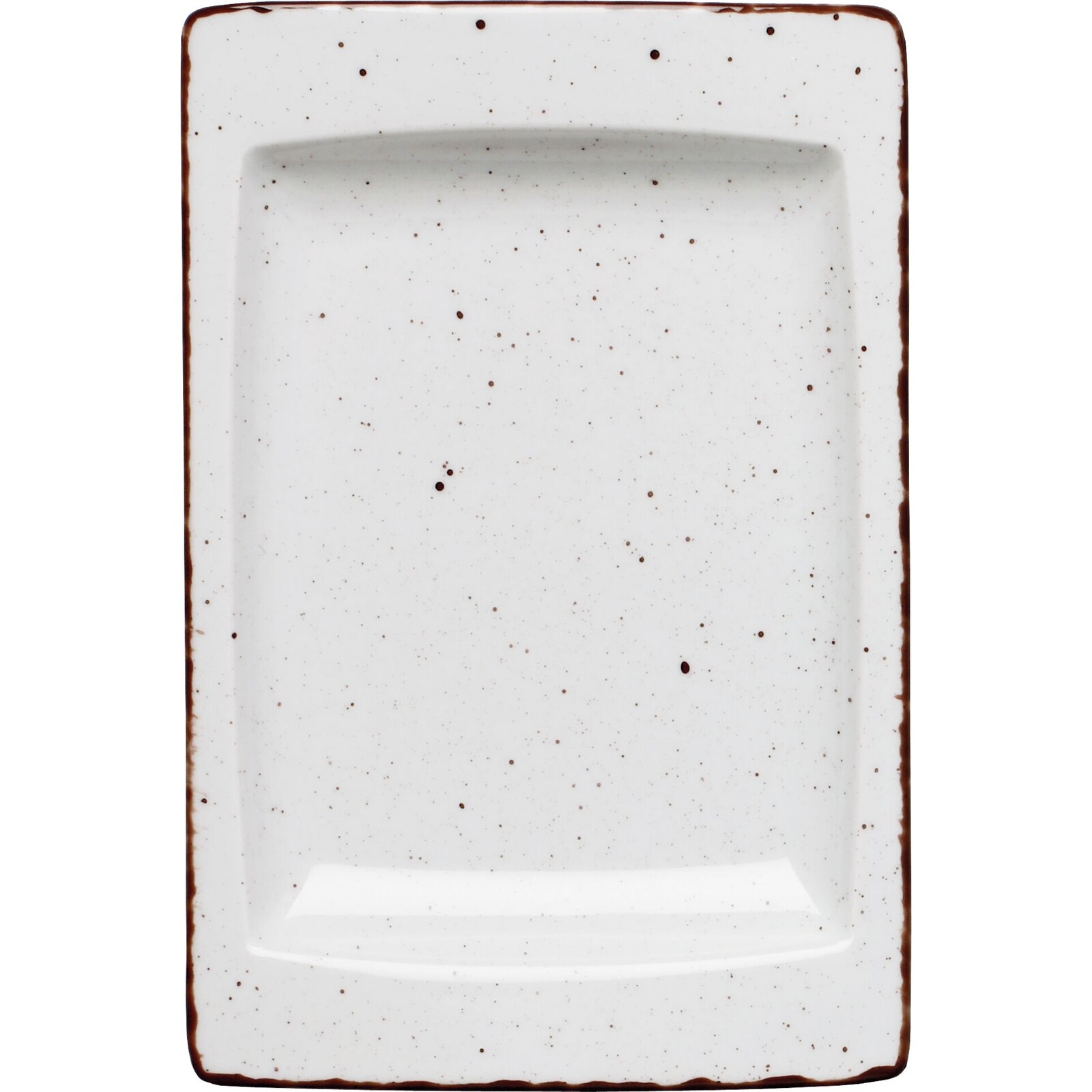 Porzellan. Grundfarbe weiß, Rand braun und Spiegel braun gesprenkelt. Mischsortierung. Spülmaschinengeeignet.
