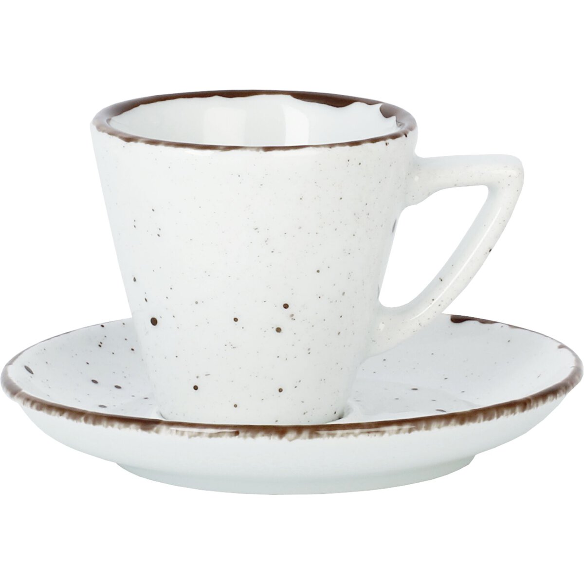 Porzellan. Grundfarbe weiß, Rand braun und Spiegel braun gesprenkelt. Mischsortierung. Spülmaschinengeeignet.