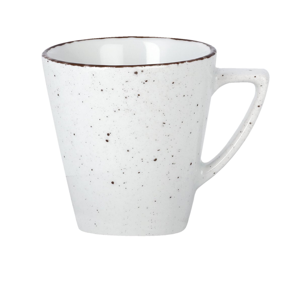 Porzellan. Grundfarbe weiß, Rand braun und Spiegel braun gesprenkelt. Mischsortierung. Spülmaschinengeeignet.