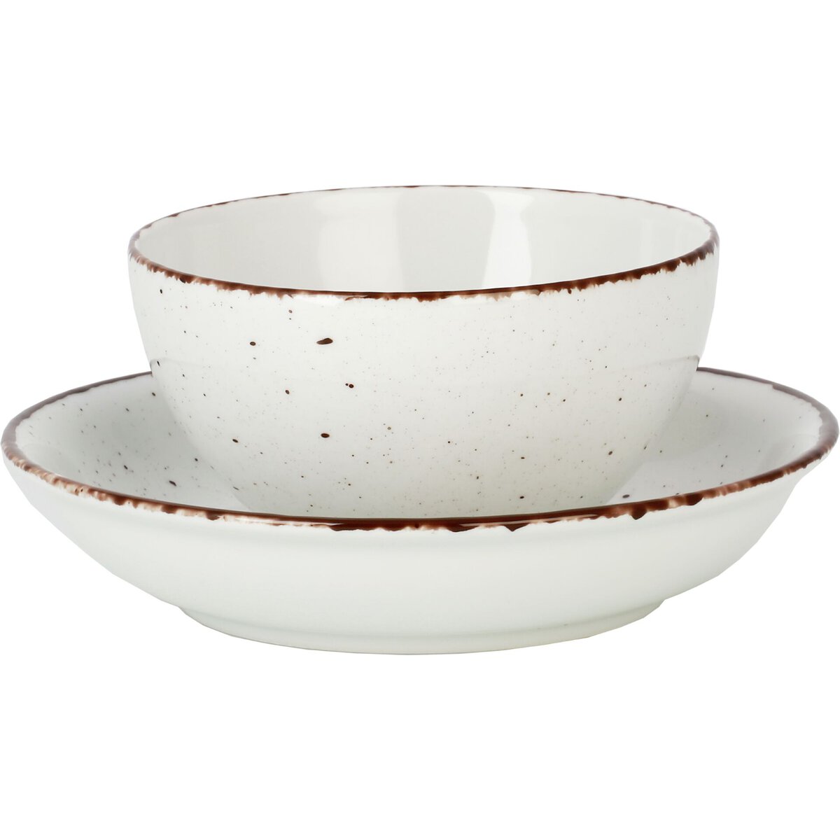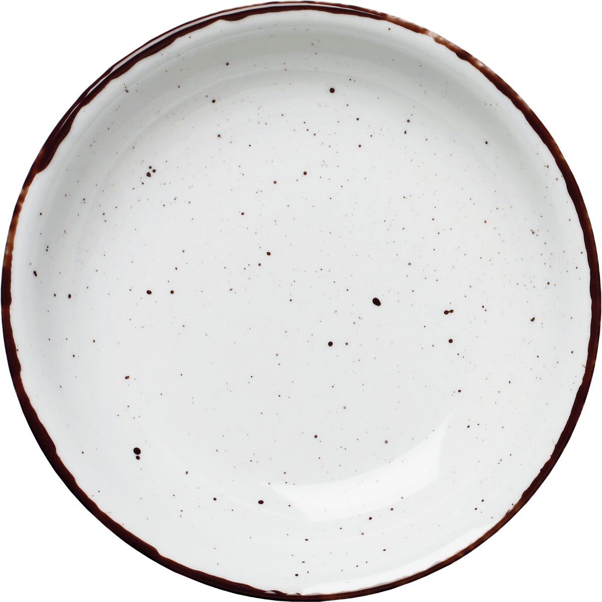 Porzellan. Grundfarbe weiß, Rand braun und Spiegel braun gesprenkelt. Mischsortierung. Spülmaschinengeeignet.
