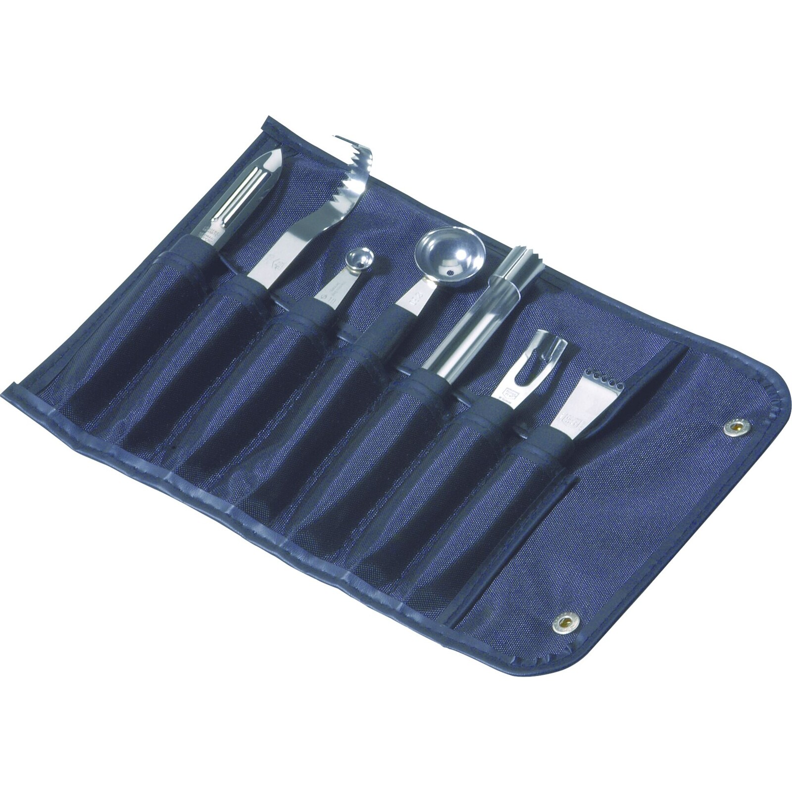 8-tlg. - inkl. Rolltasche. Set besteht aus: Kartoffelschäler 6308, Kartoffellöffel 6304.10, Juliennereißer 6312, Kartoffellöffel 2-seitig 6300, Apfelentkerner 6309, Ziseliermesser 6305, Butterroller 6306 und der Tasche aus Kunstleder.