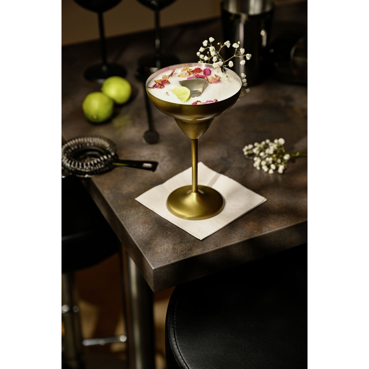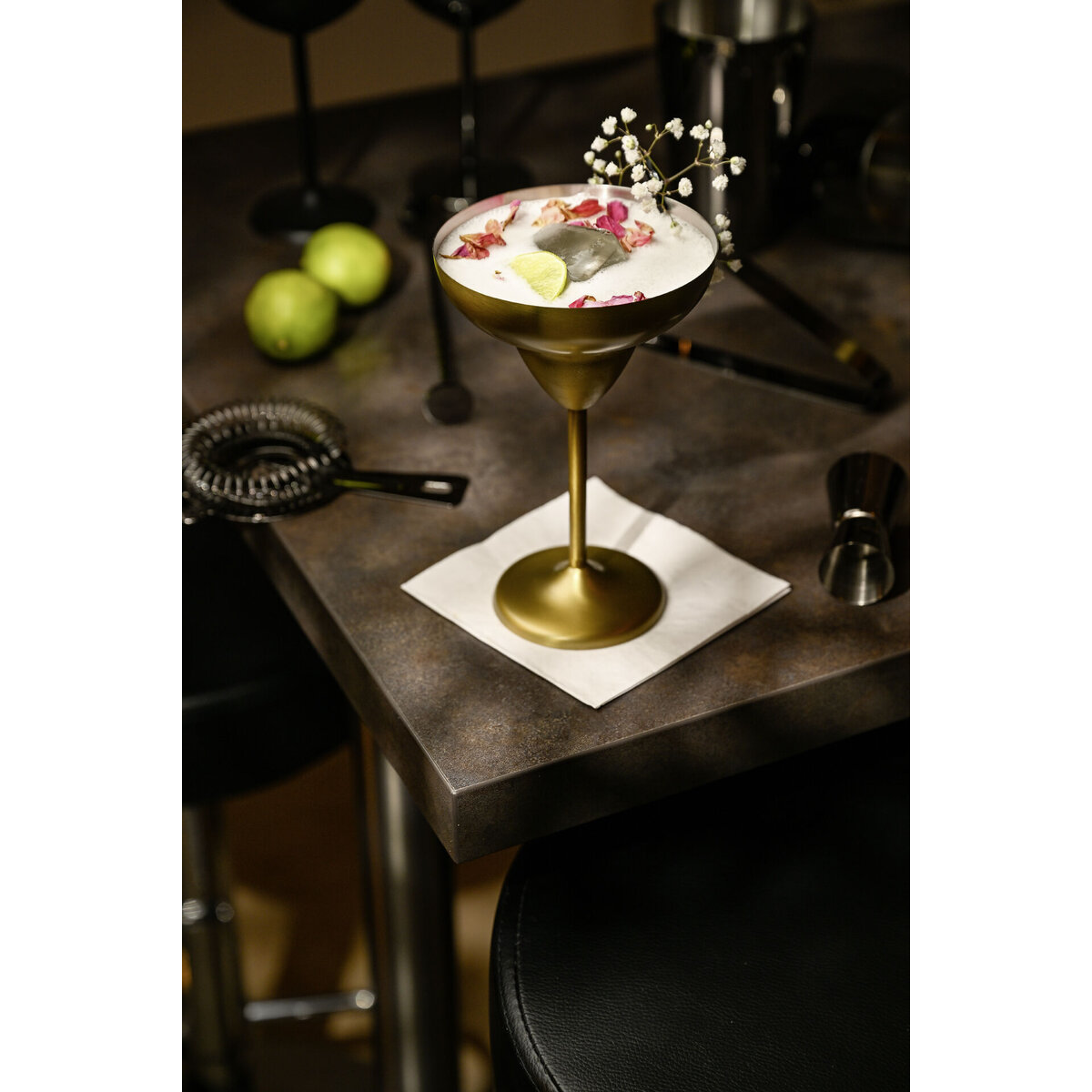 Unsere neuen Cocktailgläser aus hochwertigem Edelstahl beeindrucken mit einem modernen Design. Sie sind in drei eleganten Ausführungen erhältlich: matt in Schwarz oder Gold sowie glänzend in Anthrazit. Dank ihrer Vielseitigkeit eignen sie sich perfekt für Cocktails, kreative Desserts oder außergewöhnliche Präsentationen. Material Edelstahl, nicht spülmaschinengeeignet.