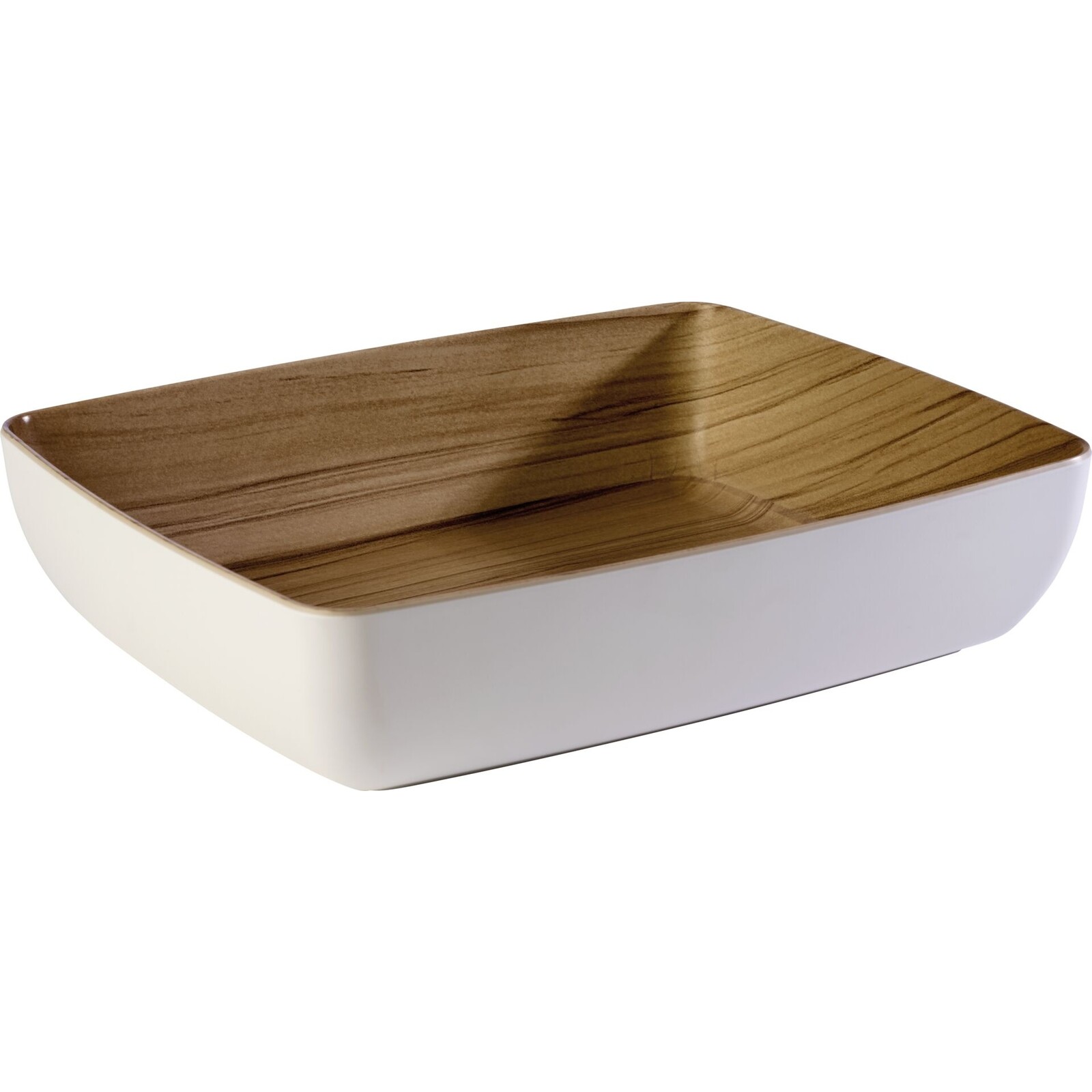 Melamin. Matte Oberflächen in Holzoptik innen und weiß außen. Stapelbar und spülmaschinengeeignet. Nicht geeignet für Backofen oder Mikrowelle und nicht direkter Hitze auszusetzen!