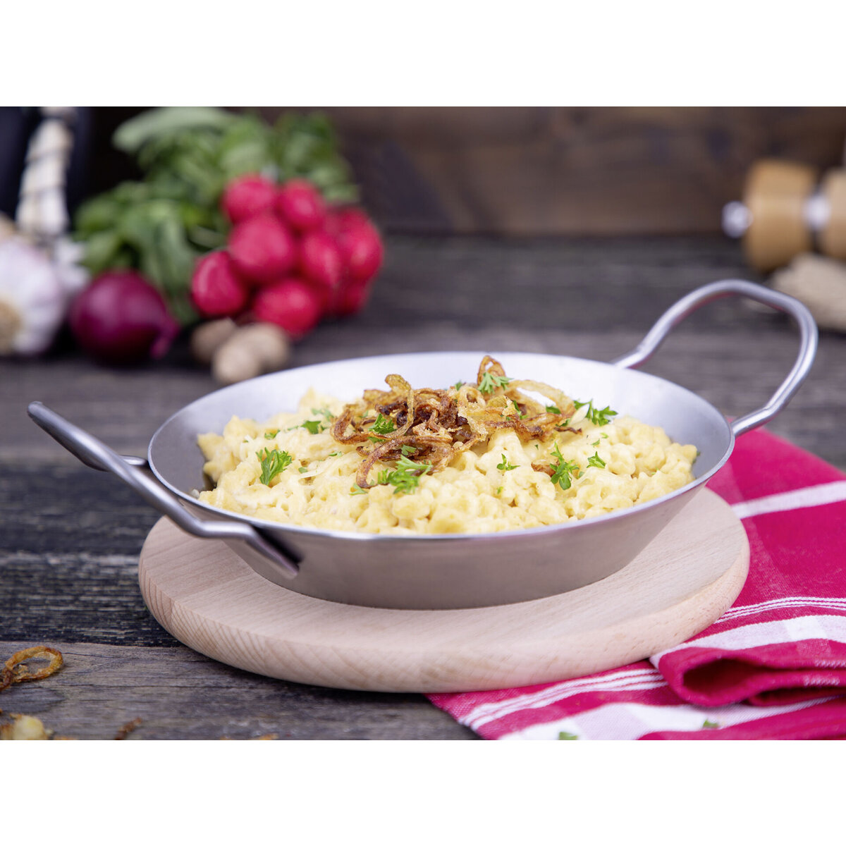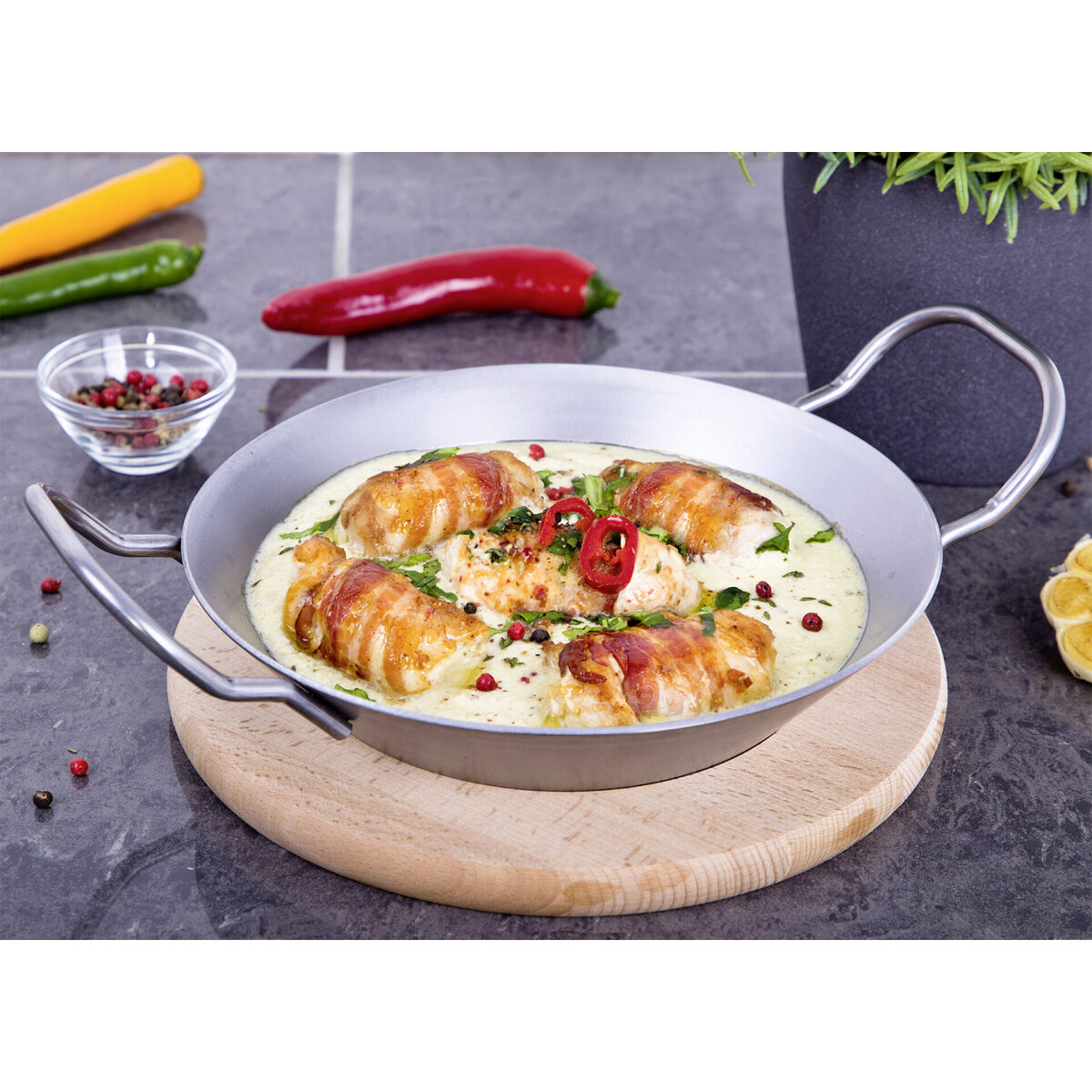 Pfännchen mit zwei Griffen, Stärke Eisen: 2,0 mm. 100% FSC zertifiziertes, Brett aus Buchenholz, Ø 20,5 cm, inkl. Einfräsung. Für alle Herdarten, Gas- und Holzkohlegrill geeignet. Nicht spülmaschinengeeignet.