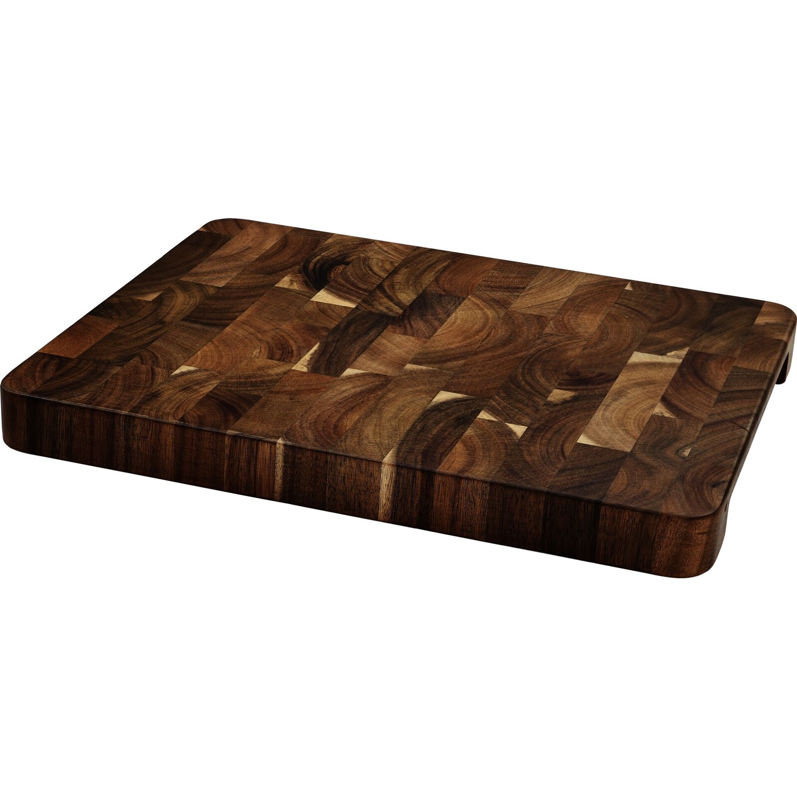 Akazienholz. Behandelt mit natürlichen Ölen. Mit Gummifüßchen und seitlichen Einkerbungen zum besseren Greifen. Stabile Ausführung. Nicht spülmaschinengeeignet.