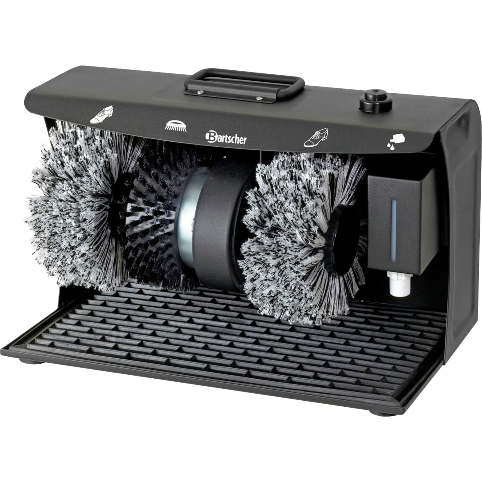 Material Stahl pulverbeschichtet, schwarz, ausgestattet mit: 3 leise laufenden Rotationsbürsten: 1 Reinigungsbürste für groben Schmutz, 2 Polierbürsten aus Terylen (Polyester) für helle oder dunkle Schuhe, Schuhcreme-Spender (unbefüllt) mit Kugelventil für 100 ml Flüssig-Schuhcreme, Schmutz-Auffangmatte für einfache Reinigung, Tragegriff oben am Gerät, wartungsfreier Motor, Fußbedienung einfach per Knopfdruck.