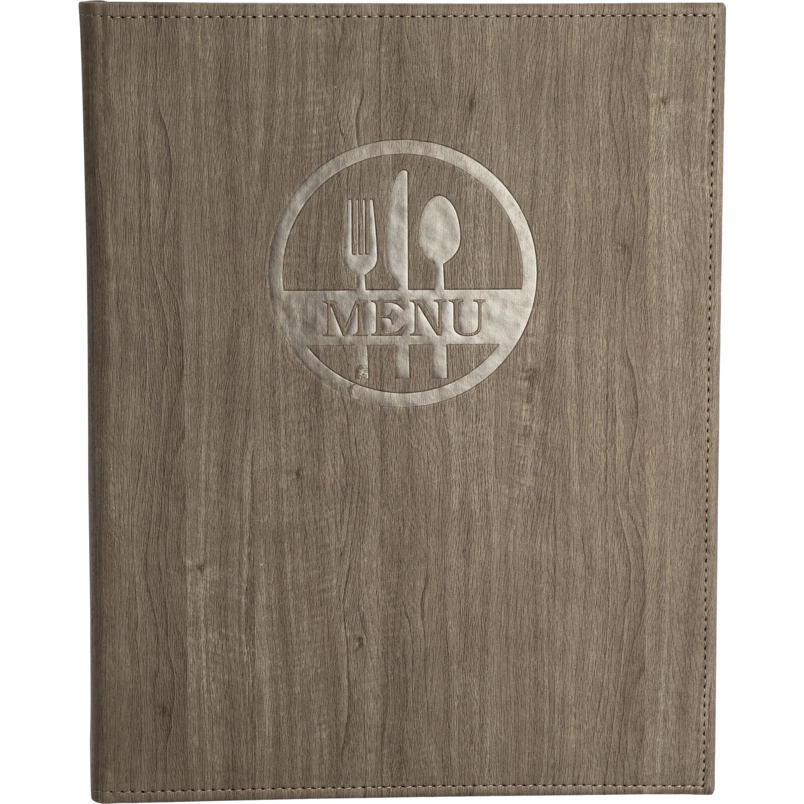 Kunstleder, DIN A4 mit 4 Buchschrauben in silber, Blindprägung "MENU". Lieferung ohne Transparenthüllen. Passende Transpartenhüllen Artikelnr. 0930/10 u. 0931/10.