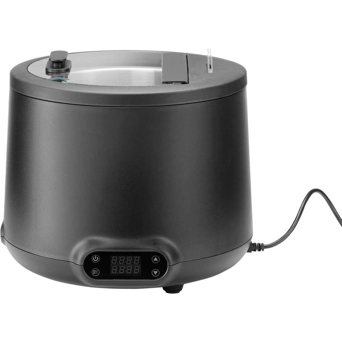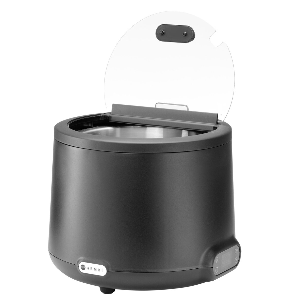Suppenstation "Uniq". Gehäuse aus PP. Herausnehmbarer und leicht zu reinigender 8-Liter-Suppenbehälter aus Edelstahl AISI 304 inklusive. Gehärteter Glasdeckel mit isoliertem Griff, Löffelaussparung und Aluminiumscharnier. Integrierter Kartenhalter am Deckel für die Speisenbezeichnungen. Das empfindliche Wassersensormodul erinnert den Benutzer daran, wann es Zeit ist, den Wasserbehälter nachzufüllen und verhindert so ein Trockensieden. Digitales Bedienfeld mit Anzeige der Arbeitszeit, der eingestellten Temperatur und der tatsächlichen Temperatur. Die letzte Temperatureinstellung wird im Gerät gespeichert und jedes Mal ausgewählt, wenn die Stromversorgung wieder aufgenommen wird. Die Temperatur kann von 35 bis 85°C in Schritten von 1°C eingestellt werden. Der Wasserbehälter ist mit einer Maximalfülllinie bei ±1,5 Litern ausgestattet. Nicht zum Kochen, sondern lediglich zum Warmhalten bestimmt.