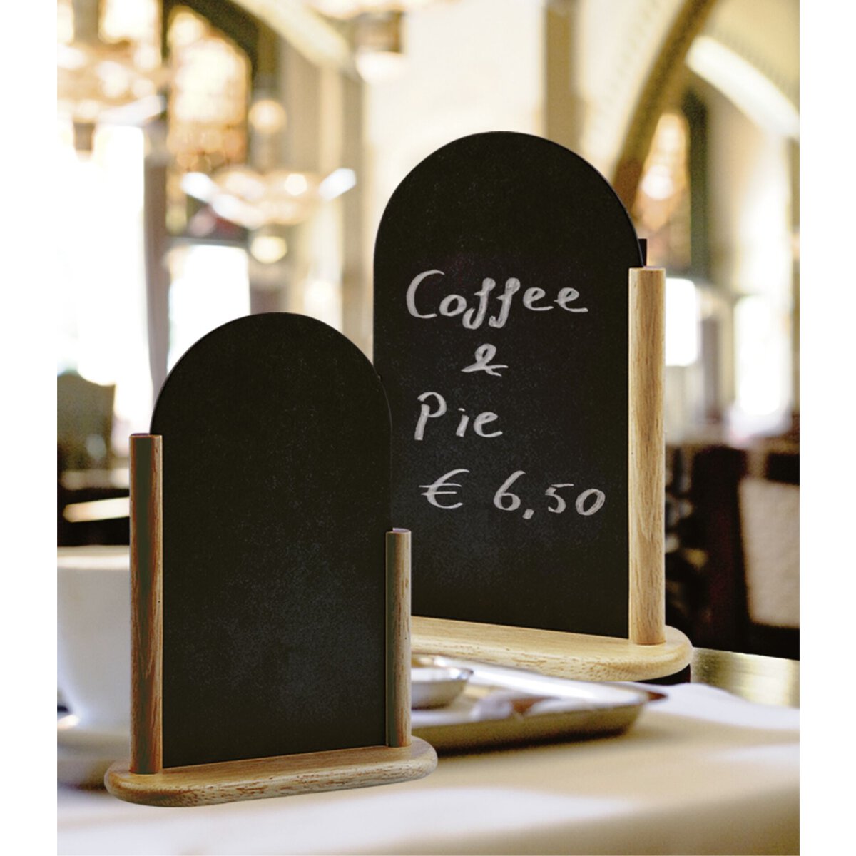 Gestell aus Holz. Inklusive einer halbrunden doppelseitigen Kreidetafel, somit beidseitig beschriftbar.