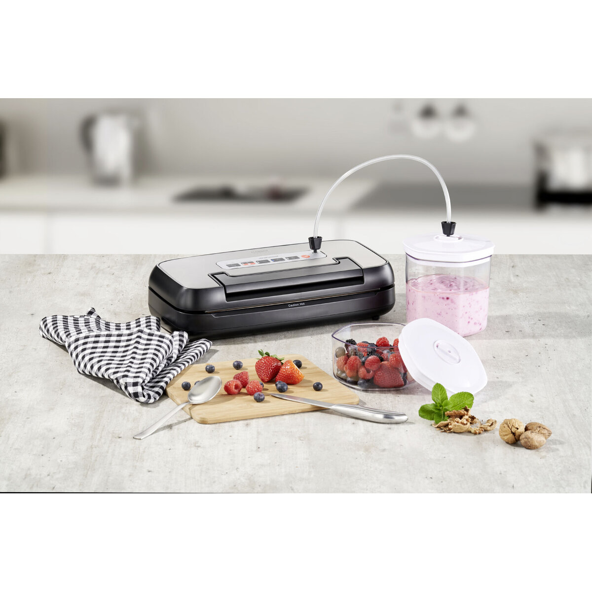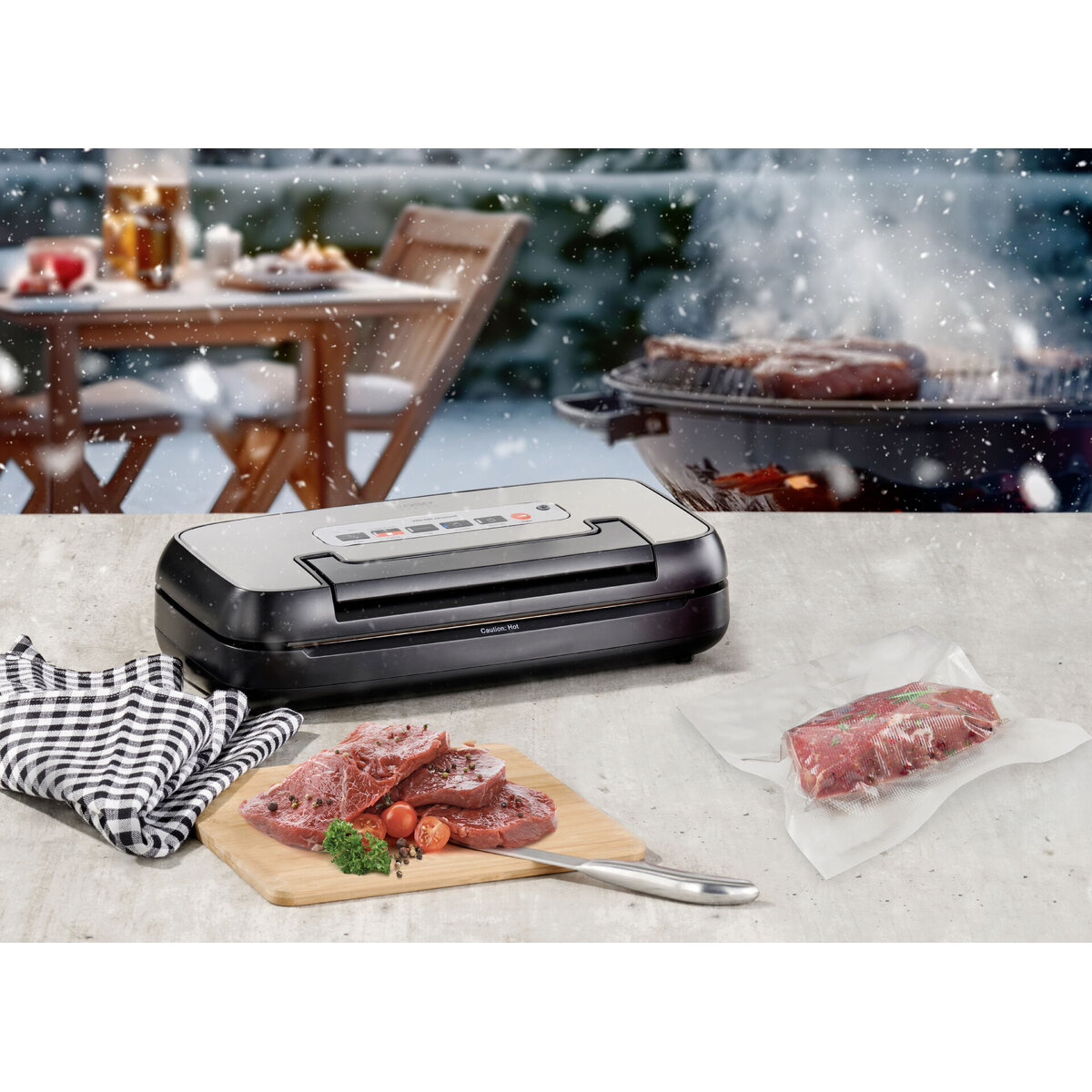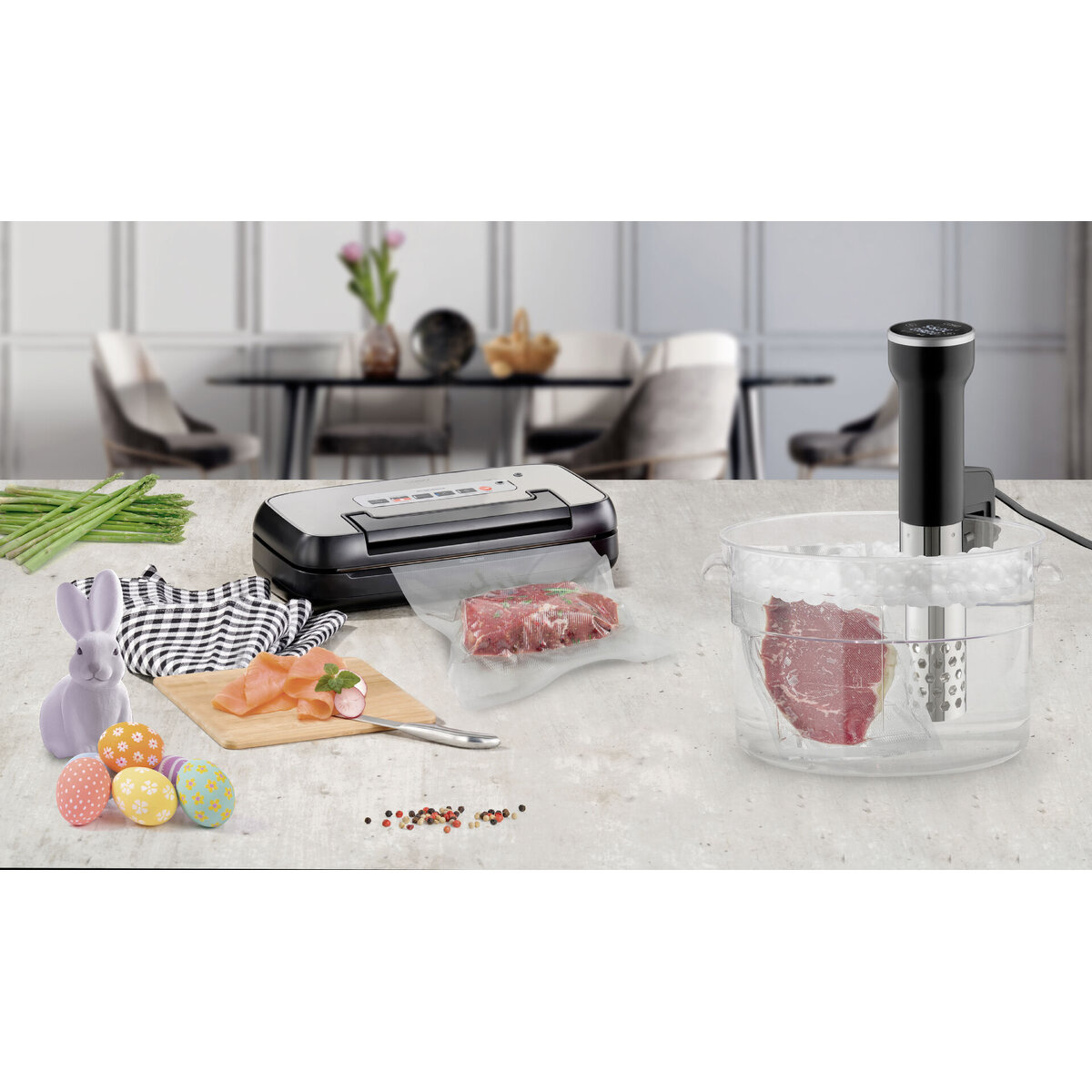 Anschlusswert: 220-240V / 50 Hz, 110 Watt. Pumpe ca. 12L/min. und einem max. Unterdruck von bis zu -0,8 bar, 2,5mm dicke, stabile Schweißnaht für Beutel bis. max. 30cm Breite und beliebiger Länge, automatisches Vakuumieren und Verschweißen, manuelles Verschweißen, regulierbare Schweißzeit für trockene und feuchte Lebensmittel, Pulse-Funktion: manuell regulierbare, stufenlose Vakuumstärke, ideal für weiche, empfindliche Lebensmittel, Marinier-Funktion, integriertes Rollenfach mit praktischem Cutter zum Zuschneiden der Folienrollen, praktische Einhandbedienung, herausnehmbare Auffangschale für angesammelte Flüssigkeit, elektronische Temperaturüberwachung, inkl. 1 Profi-Rolle 28x300cm, 10 Profi-Beutel 20x30cm, 1 Vakuumierschlauch. Passende Beutel und Schläuche: 143510, 143550, 17417, 17418, 17420 u. 17421.